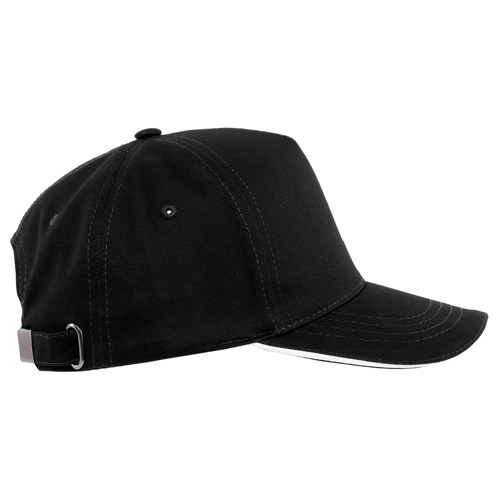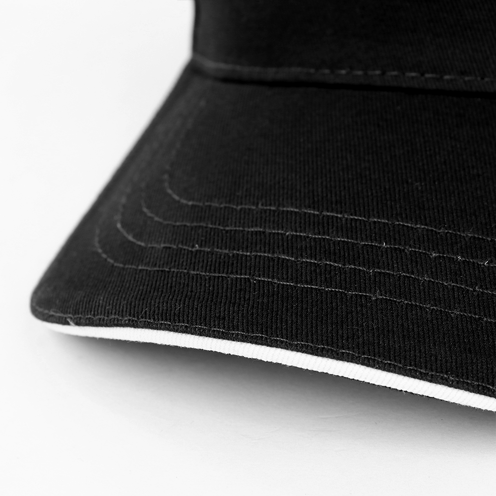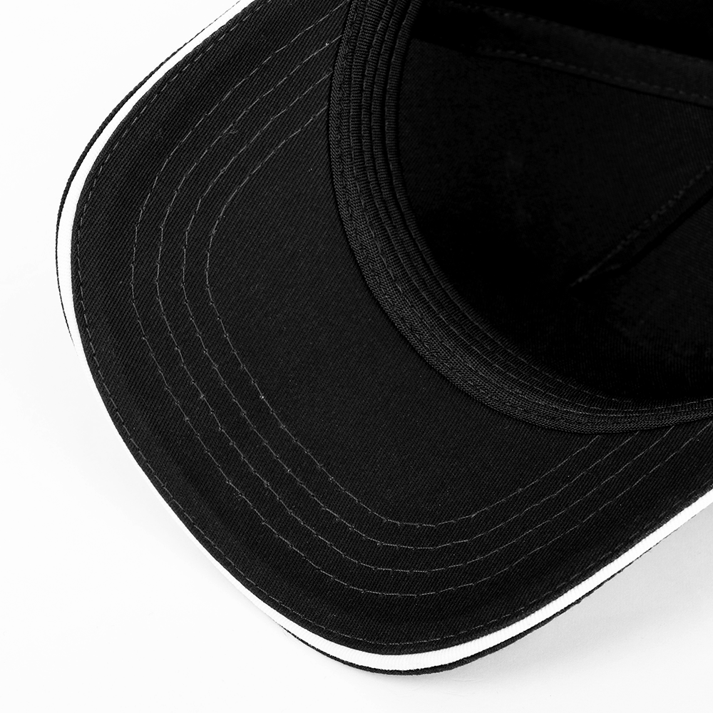 Пятиклиновый пошив, отсутствие лобового шва и изогнутый жесткий козырек «сэндвич» с контрастным кантом. Посадка регулируется ремешком с металлической застежкой.