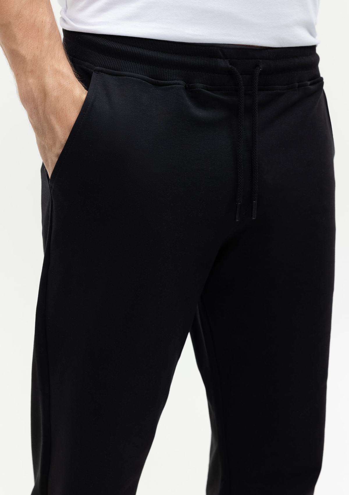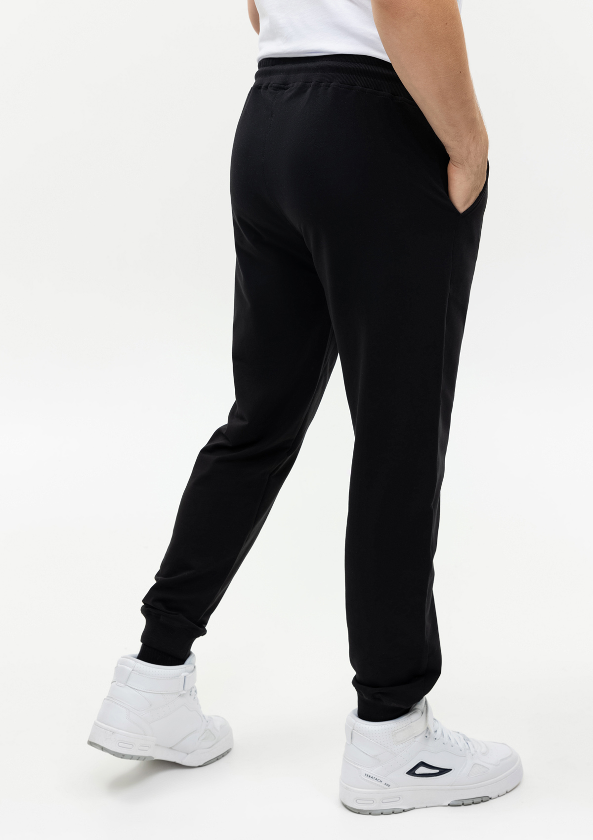 Мужские брюки свободного силуэта с эластичным поясом и прорезным карманом. Широкий пояс со шнурком в тон основному цвету обеспечивает удобную посадку на талии.