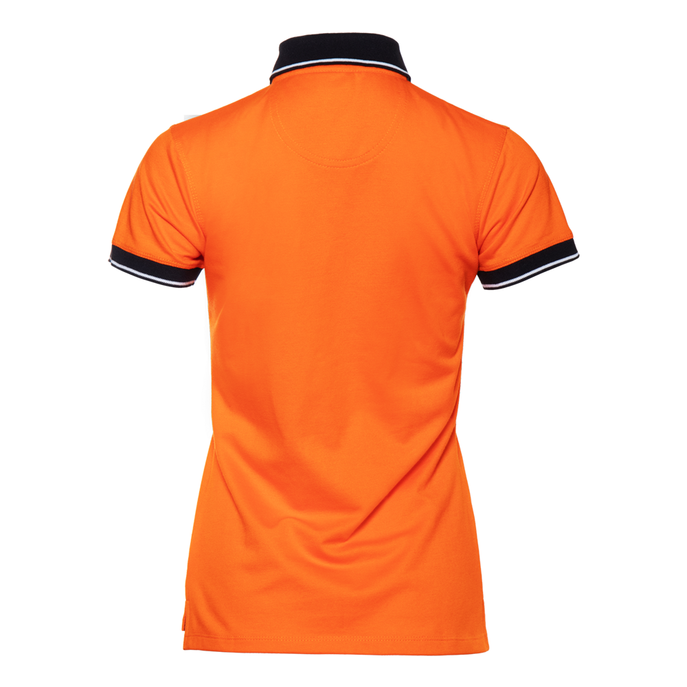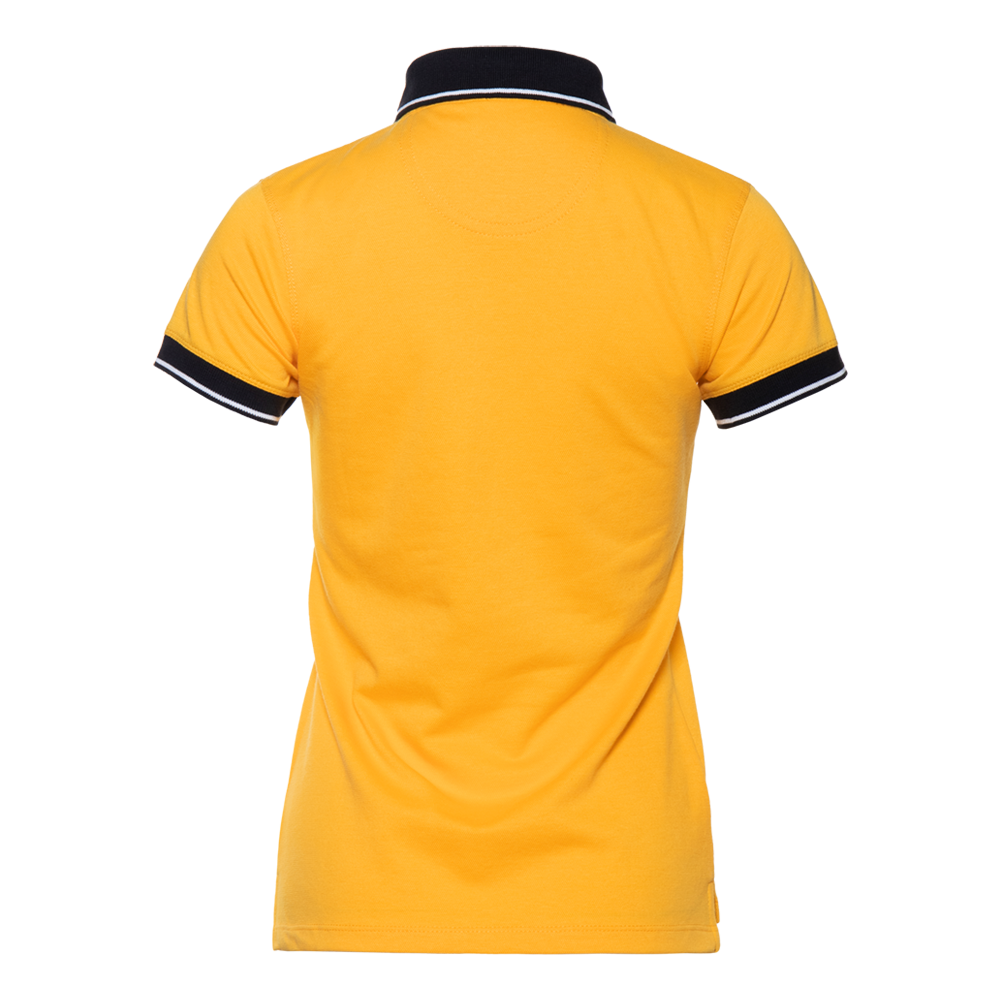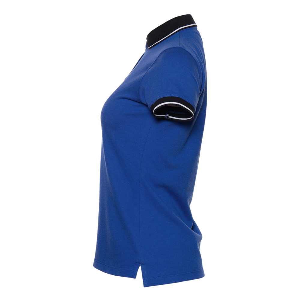 Женская рубашка поло приталенного силуэта с контрастным отложным воротником и манжетом, втачным коротким рукавом и застежку на пуговицы. Асимметричный крой гарантирует свободу движения и защиту спины от продувания ветром.