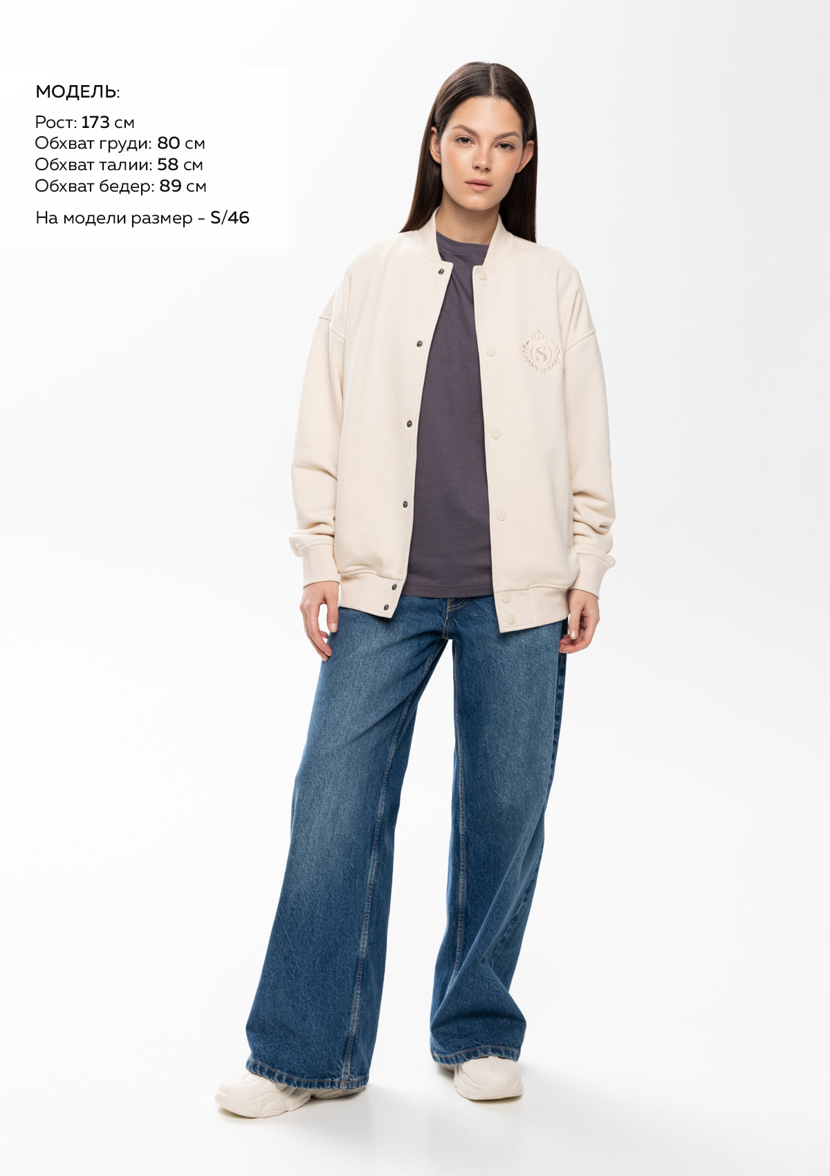 Размер женского бомбера: S/46. Параметры модели: рост 173 см.; обхват груди 80 см.; обхват талии 58 см.; обхват бедер 89 см.