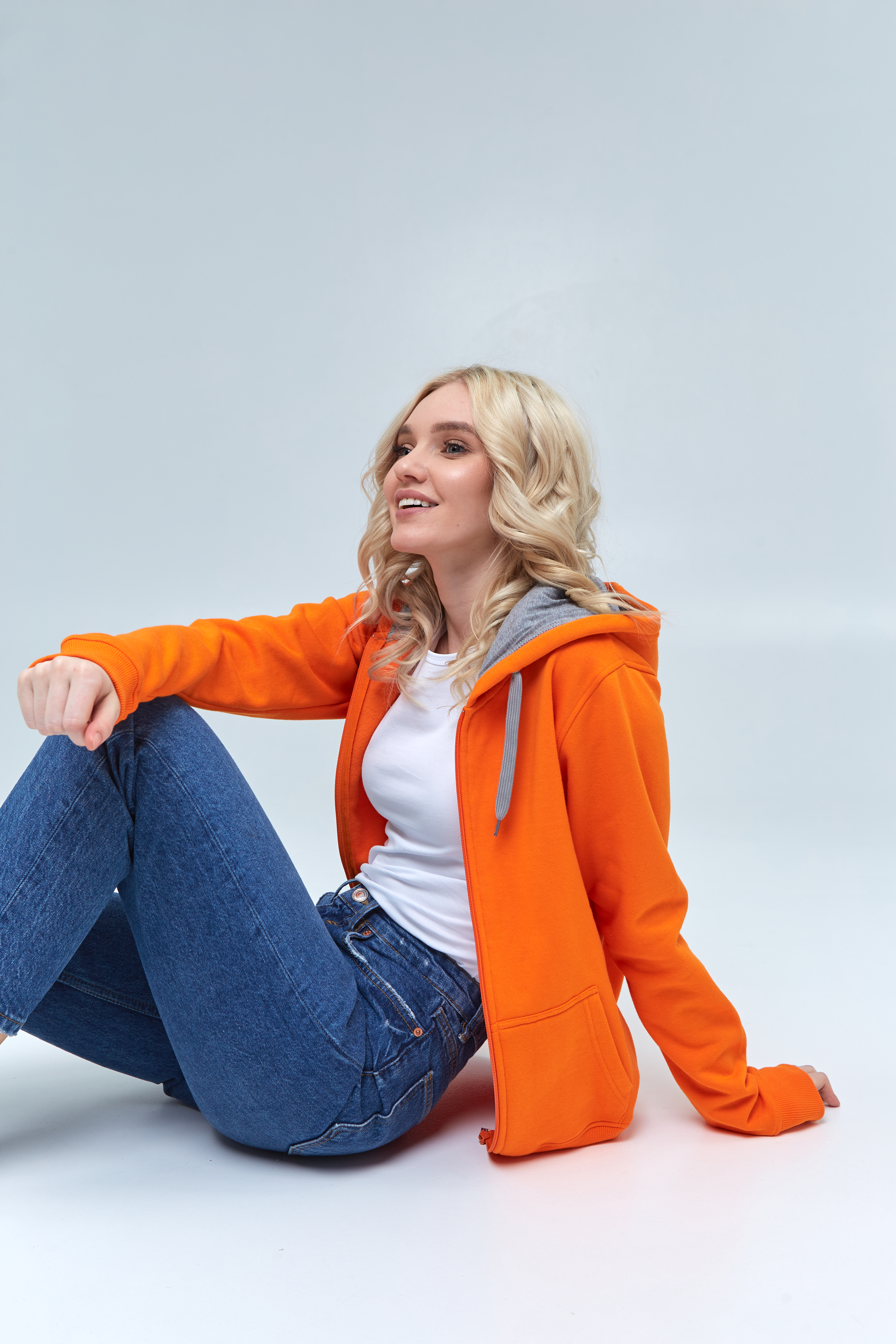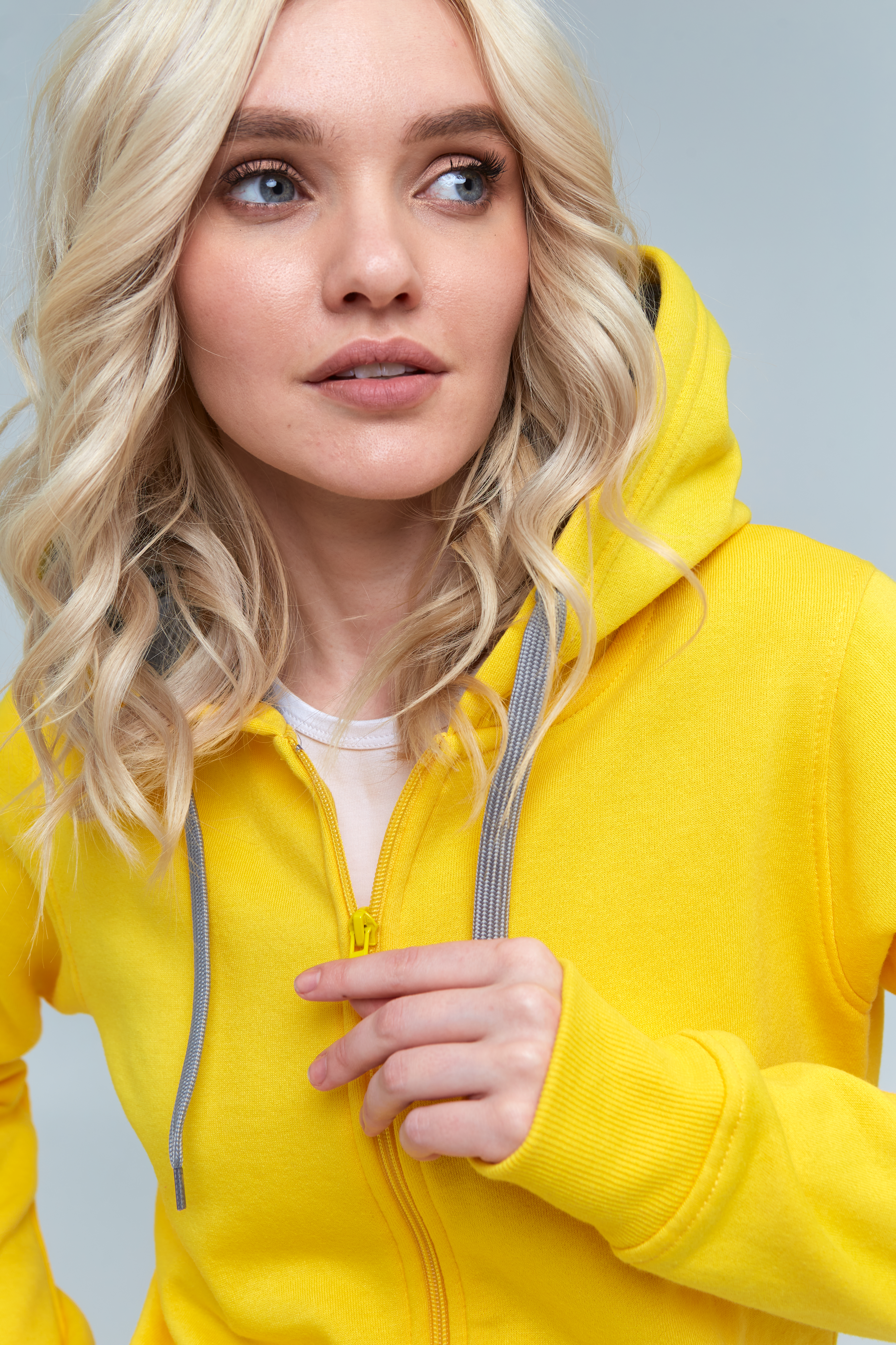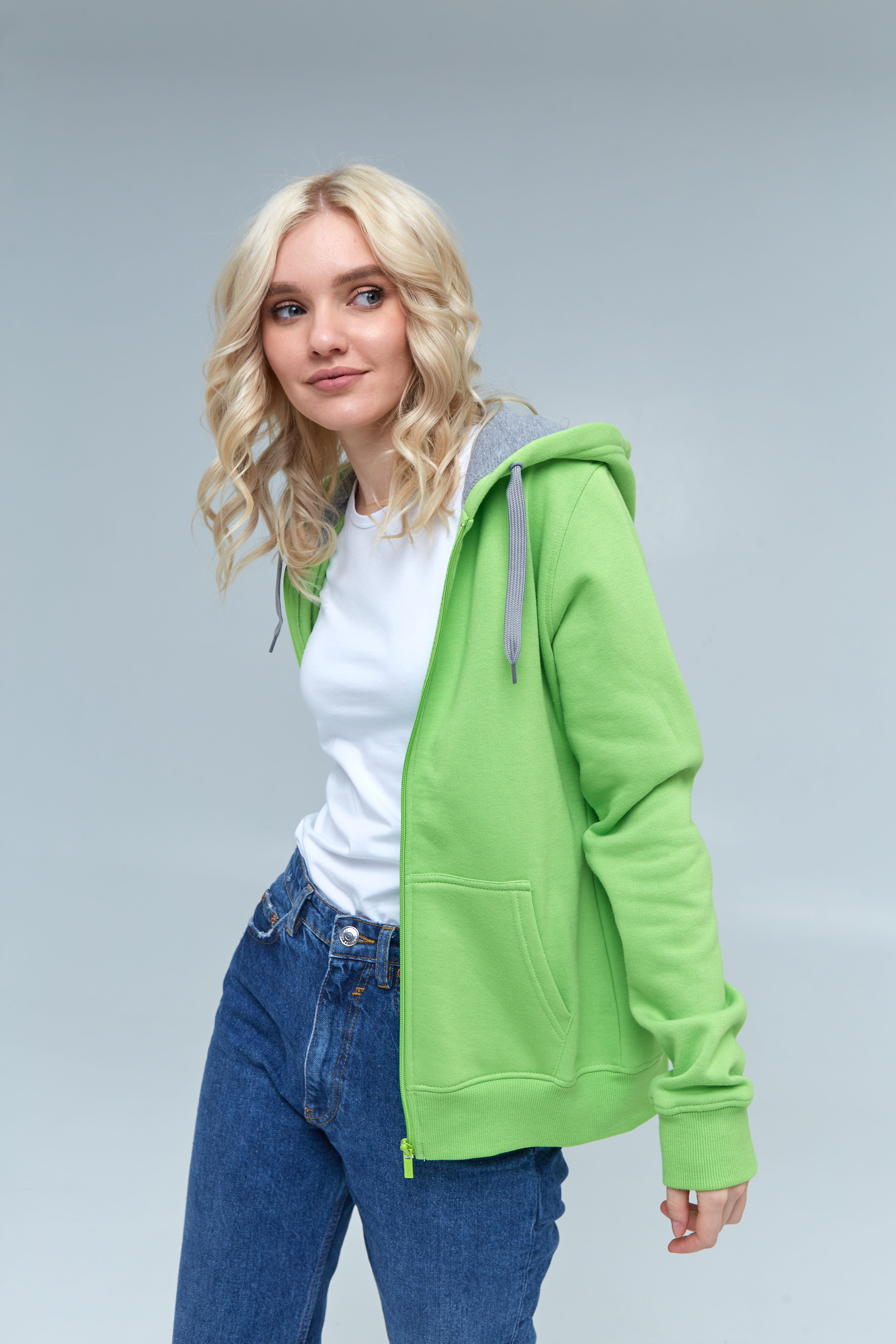 Женская толстовка приталенного кроя с капюшоном комфортной глубины, втачным рукавом, накладным карманом и застежкой на молнию в тон основному цвету. Для дополнительной защиты от холода ворот, манжет и низ изделия оформлены эластичной бейкой.