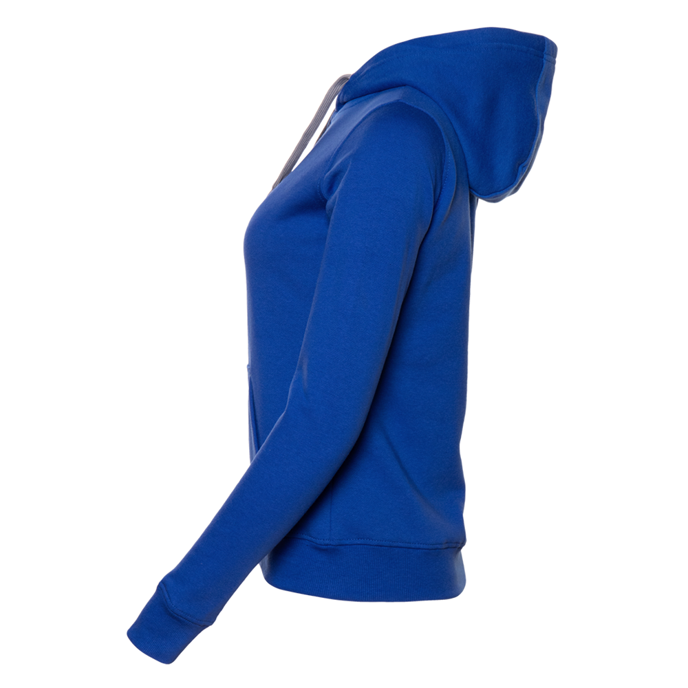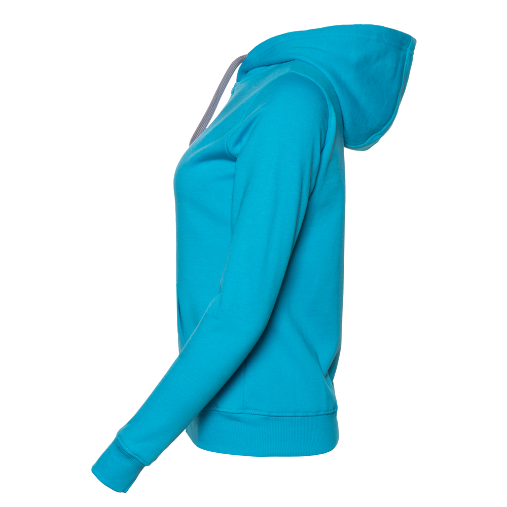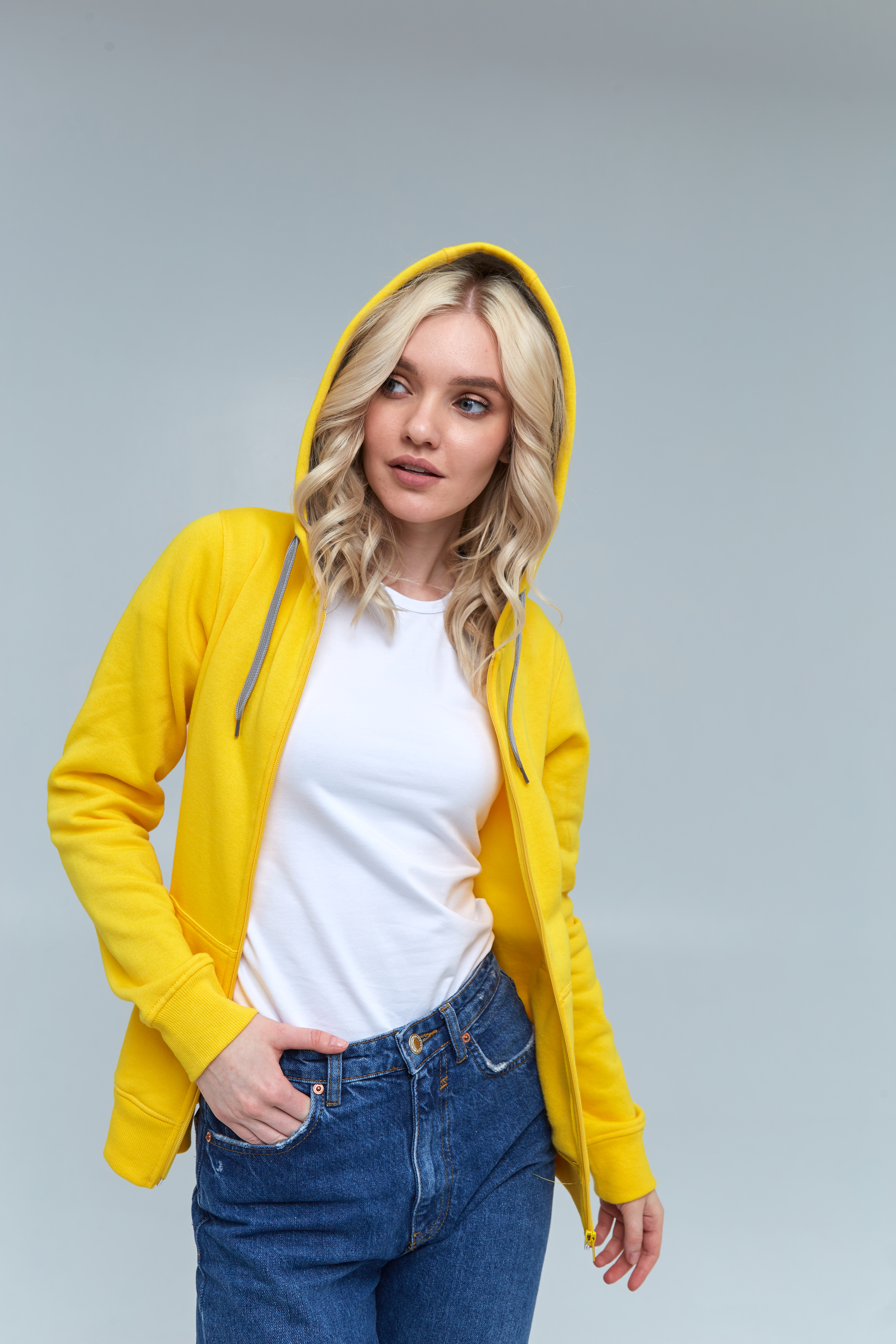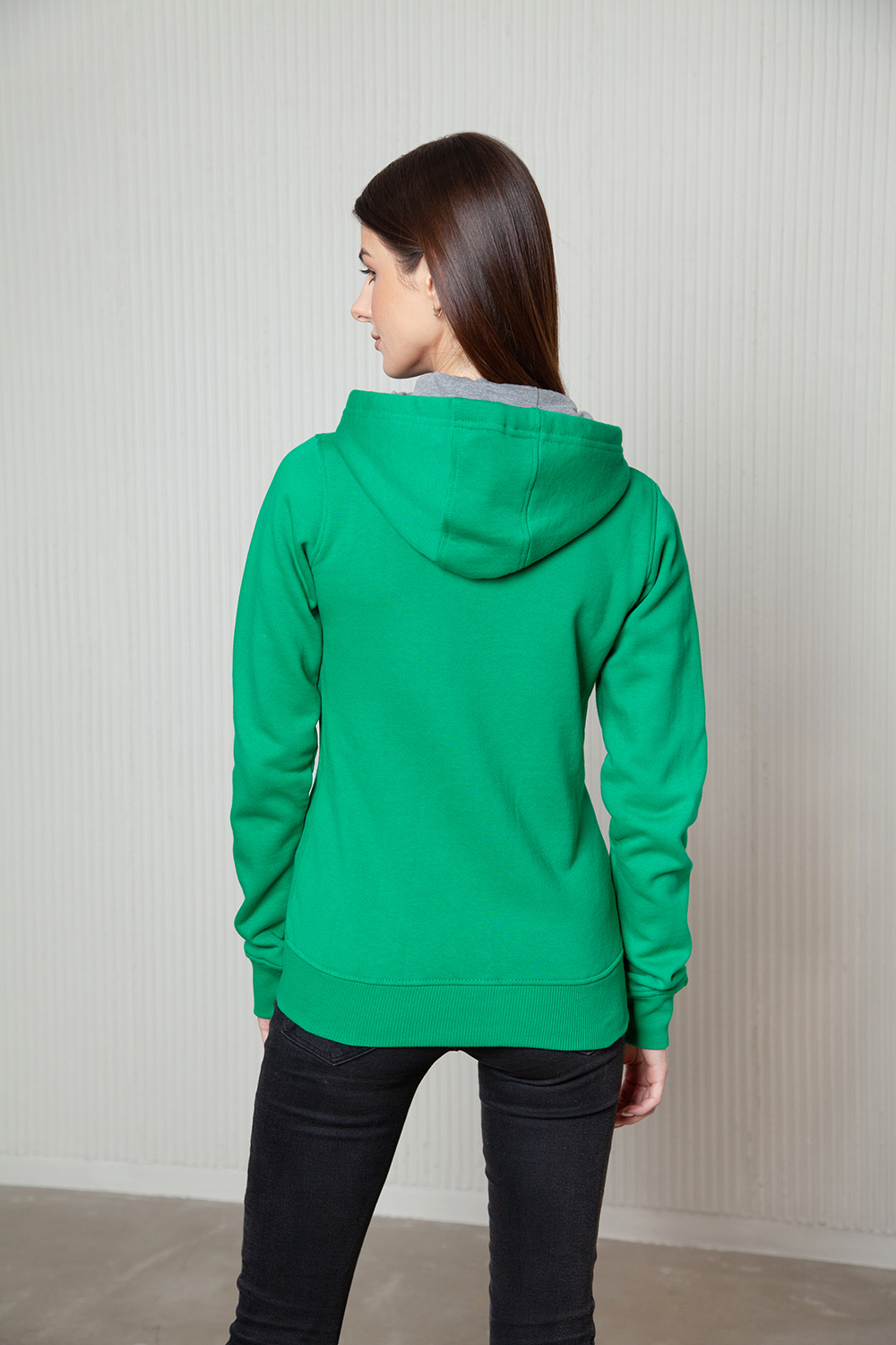 Женская толстовка приталенного кроя с капюшоном комфортной глубины, втачным рукавом, накладным карманом и застежкой на молнию в тон основному цвету. Для дополнительной защиты от холода ворот, манжет и низ изделия оформлены эластичной бейкой.