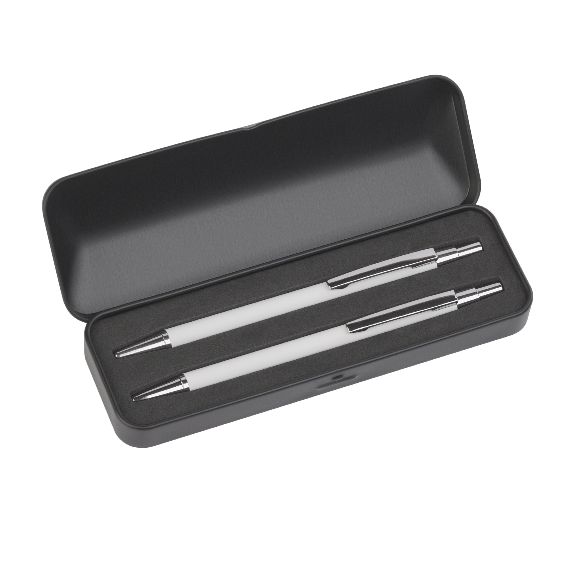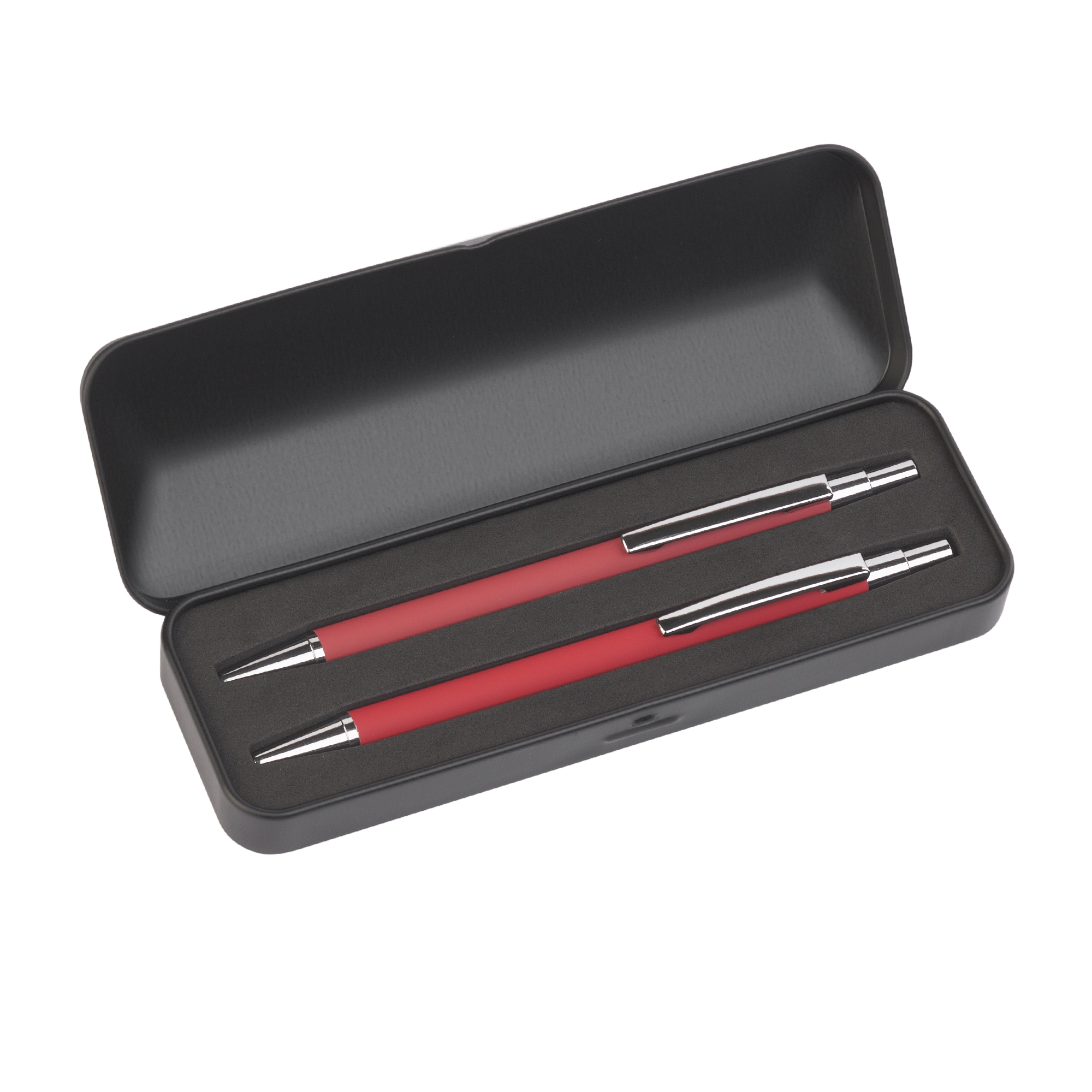Металлическая ручка и карандаш с корпусом в покрытии soft touch в металлическом черном футляре.