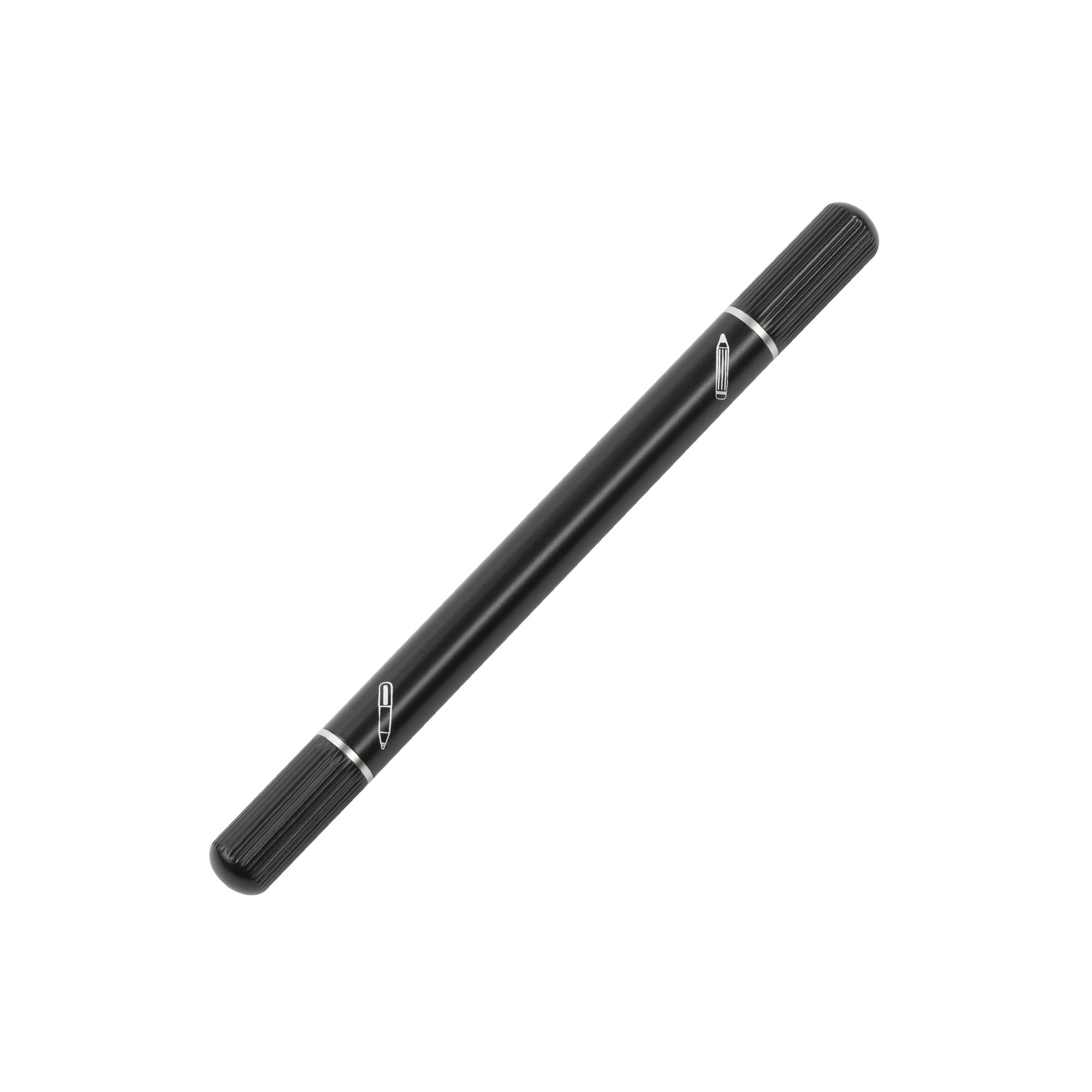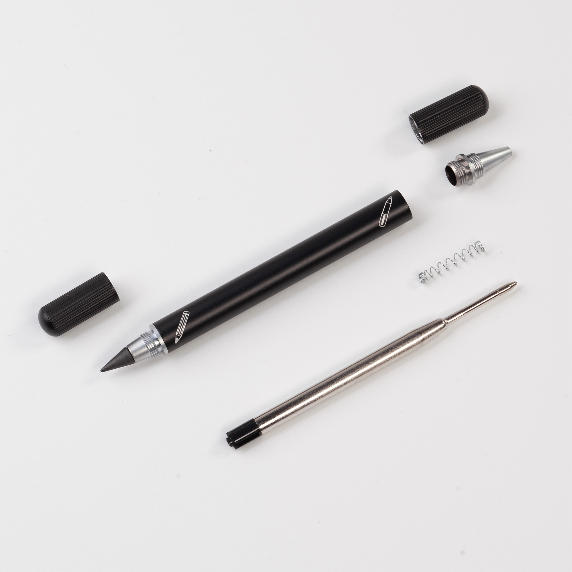 Набор из 2х письменных принадлежностей в едином корпусе - шариковой ручки и вечного карандаша, грифель которого выполнен из сверхпрочного графита с длиной письма до 30 000 метров, Закручивающиеся колпачки надёжно сохраняют пишущие узлы от внешних воздействий.