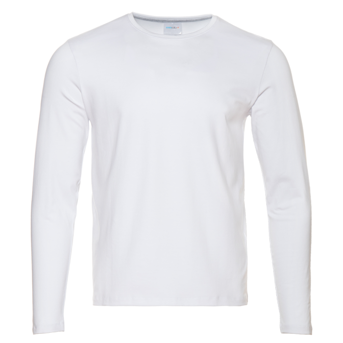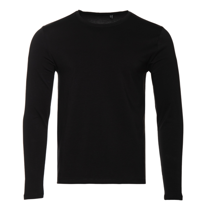 Универсальная футболка прямого силуэта с округлым воротом и длинным втачным рукавом. Плечевые швы и шов горловины усилены настрочной бейкой из основного полотна.