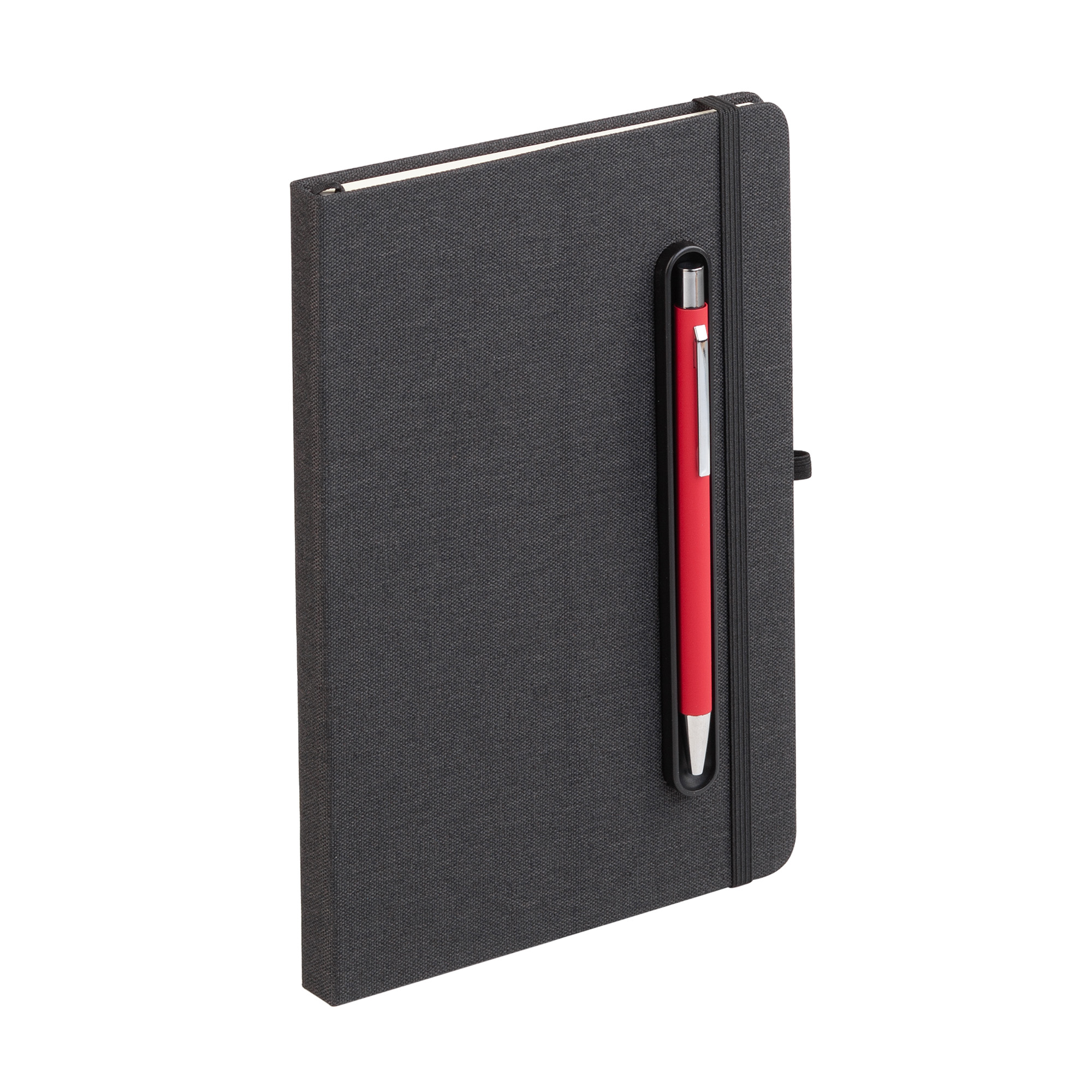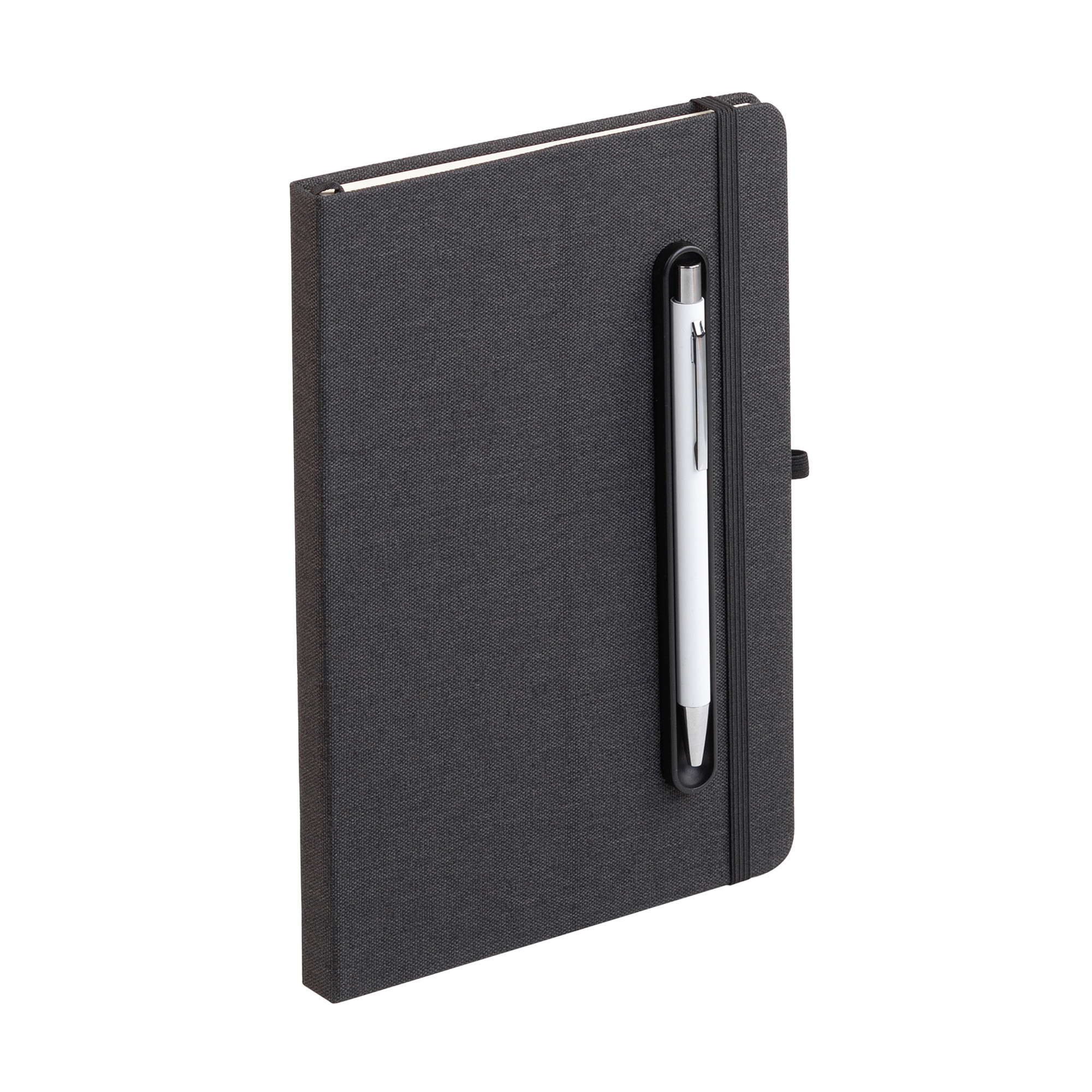 - Блокнот формата А5 с резинкой-фиксатором и встроенным в обложку магнитным держателем для ручки. Внутренний блок состоит из 160 страниц в линейку бумаги плотностью 70 г/м2. Материал обложки изготовлен из переработанного (RPET) пластика. Магниты прочно и надёжно закрепляют металлическую ручку на обложке. Бонус – обложка трансформируется в удобную подставку для смартфона/планшета/ноутбука;