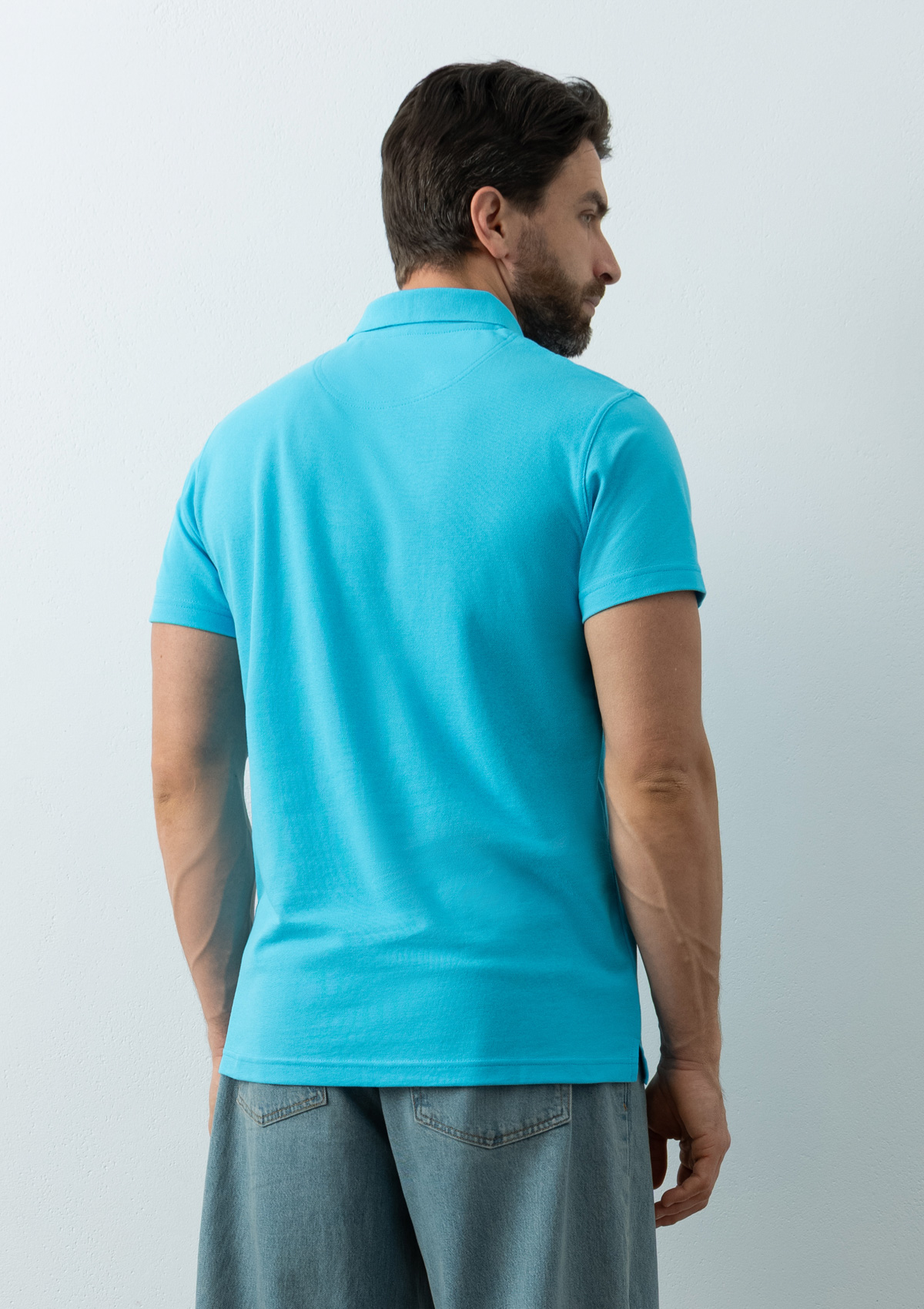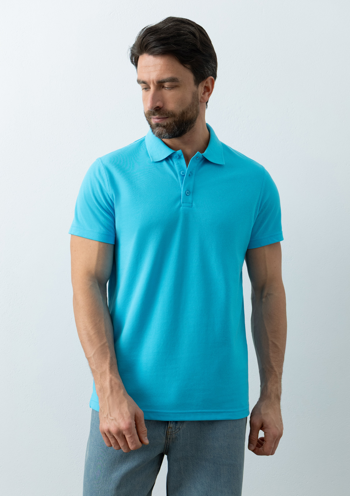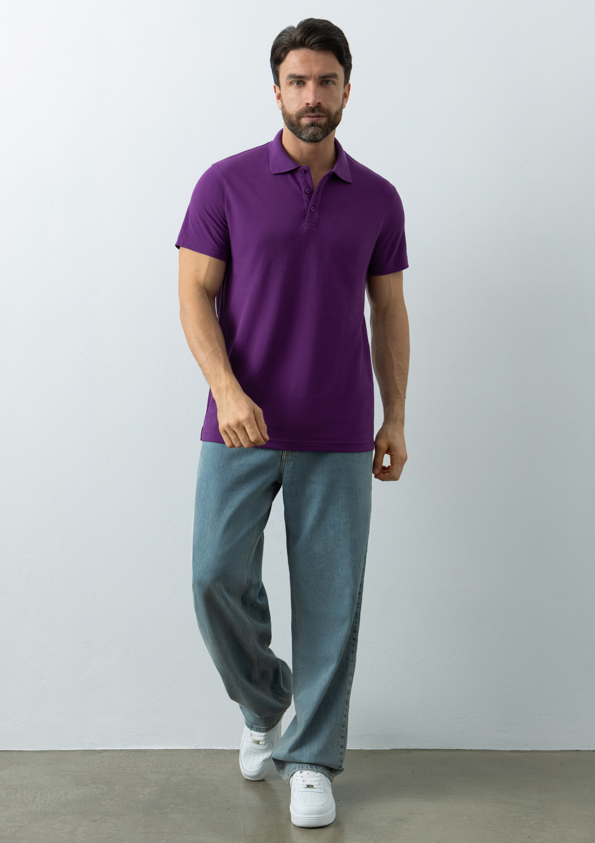 Мужское поло прямого силуэта с отложным воротником, коротким втачным рукавом и застежкой на пуговицы в тон основному цвету.