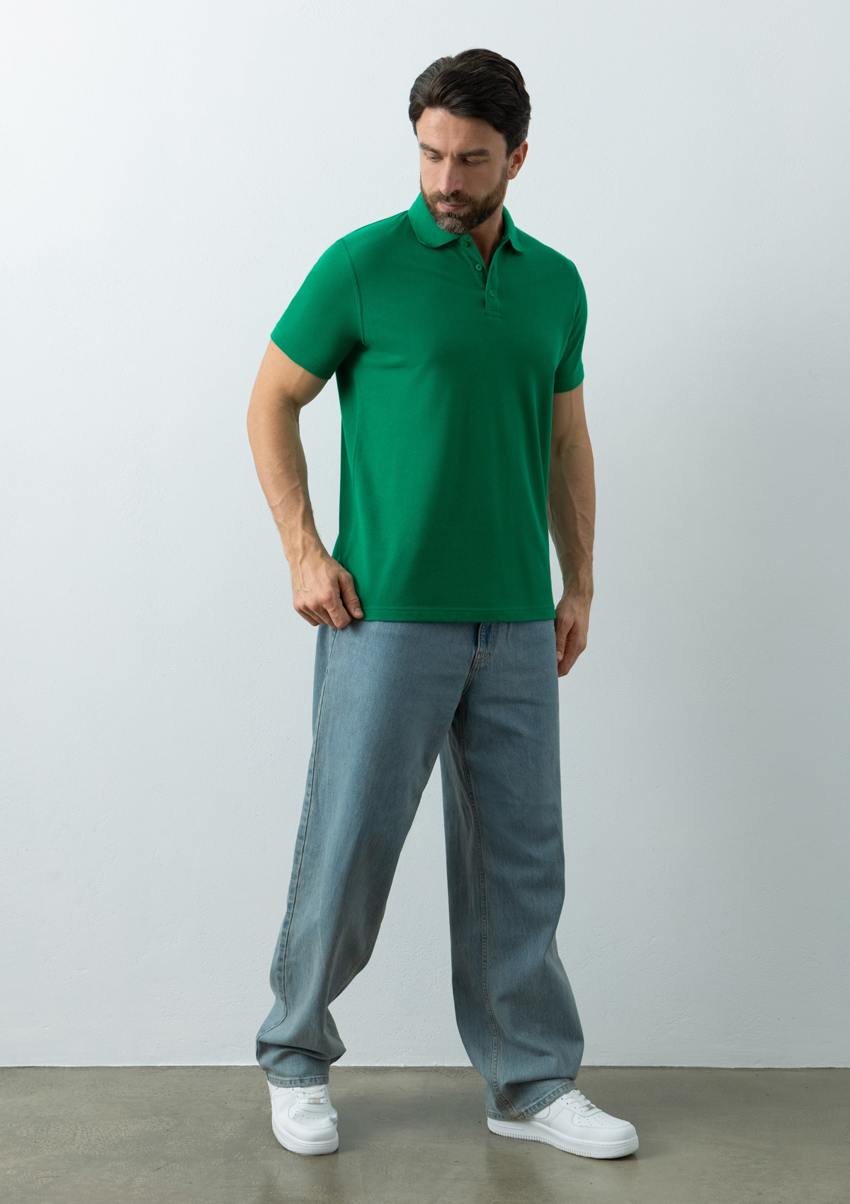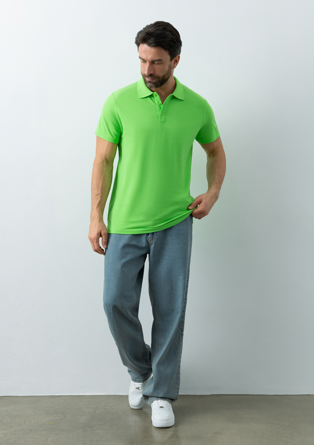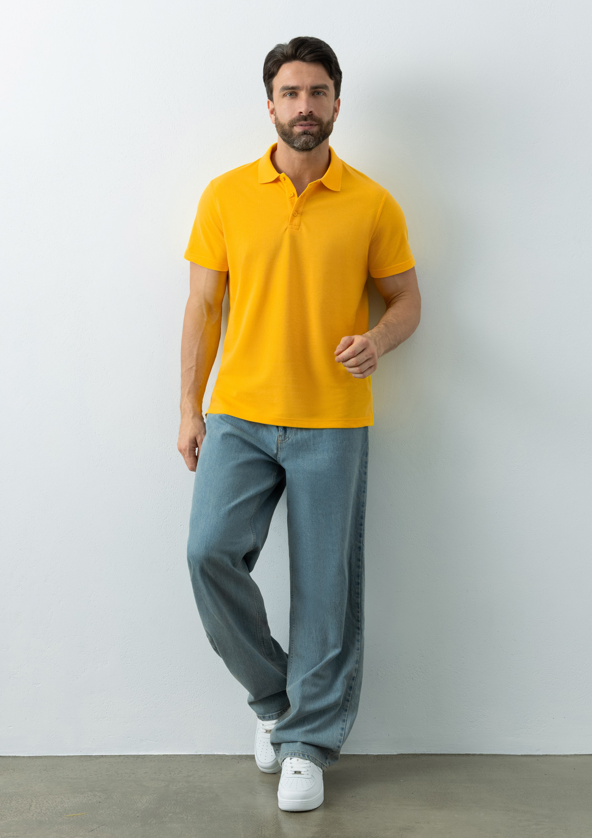 Мужское поло прямого силуэта с отложным воротником, коротким втачным рукавом и застежкой на пуговицы в тон основному цвету.