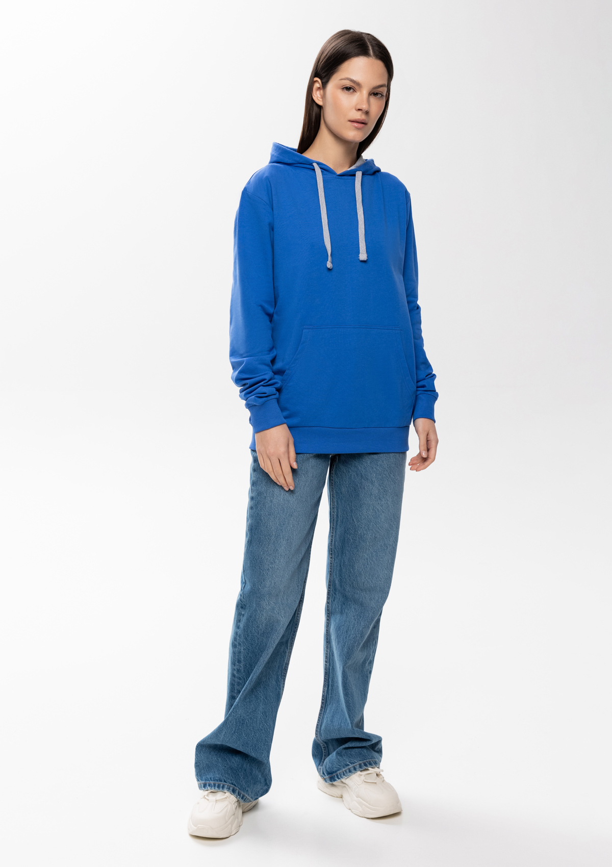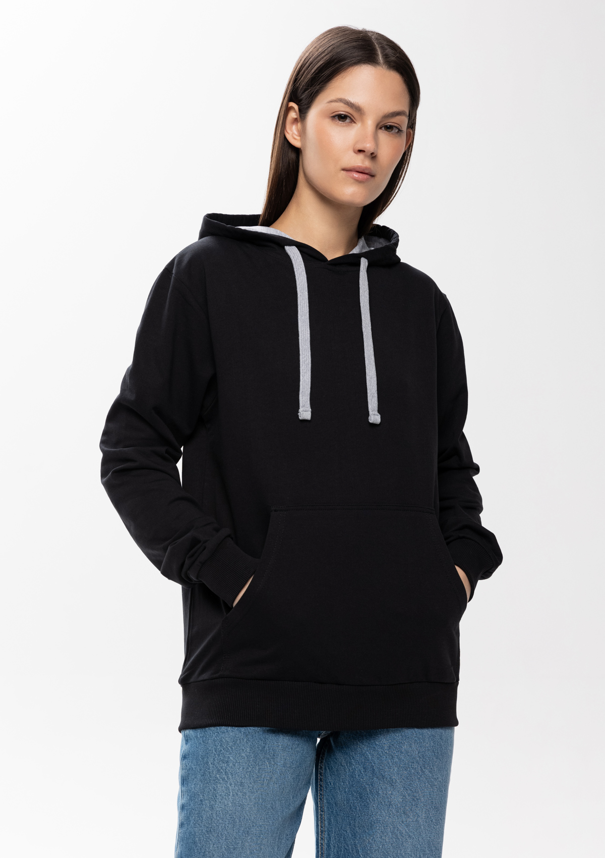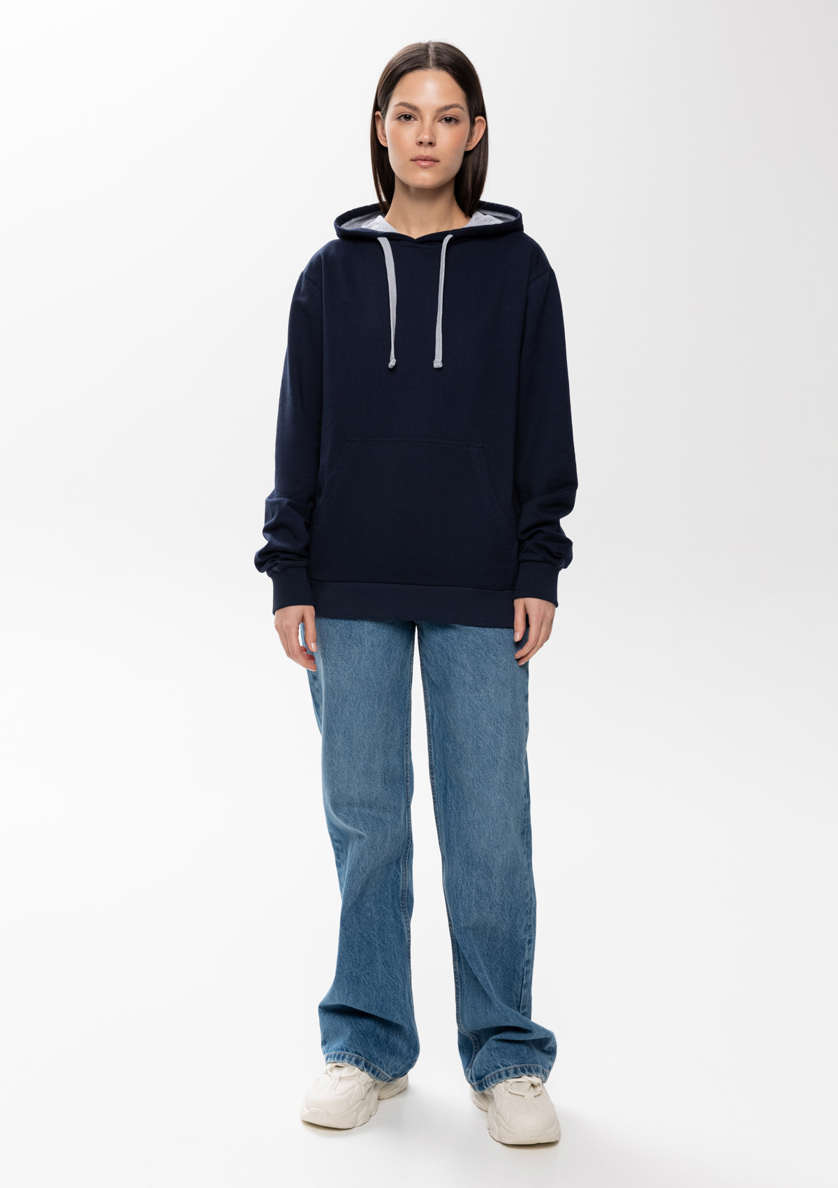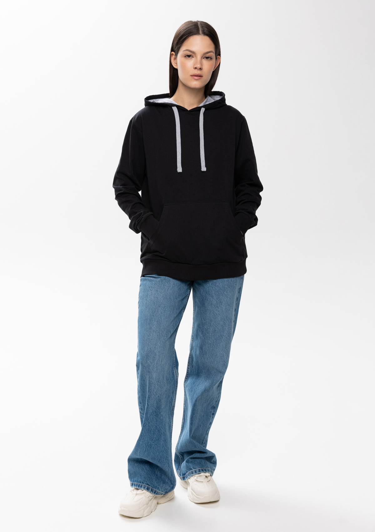 Толстовка прямого силуэта с капюшоном, втачным рукавом и карманом-кенгуру. Капюшон дополнен шнурком для регулирования прилегания, манжет и низ изделия оформлены широкой эластичной резинкой. Возможно два варианта исполнения: контрастные шнурок и бейка/шнурок и бейка в цвет толстовки.