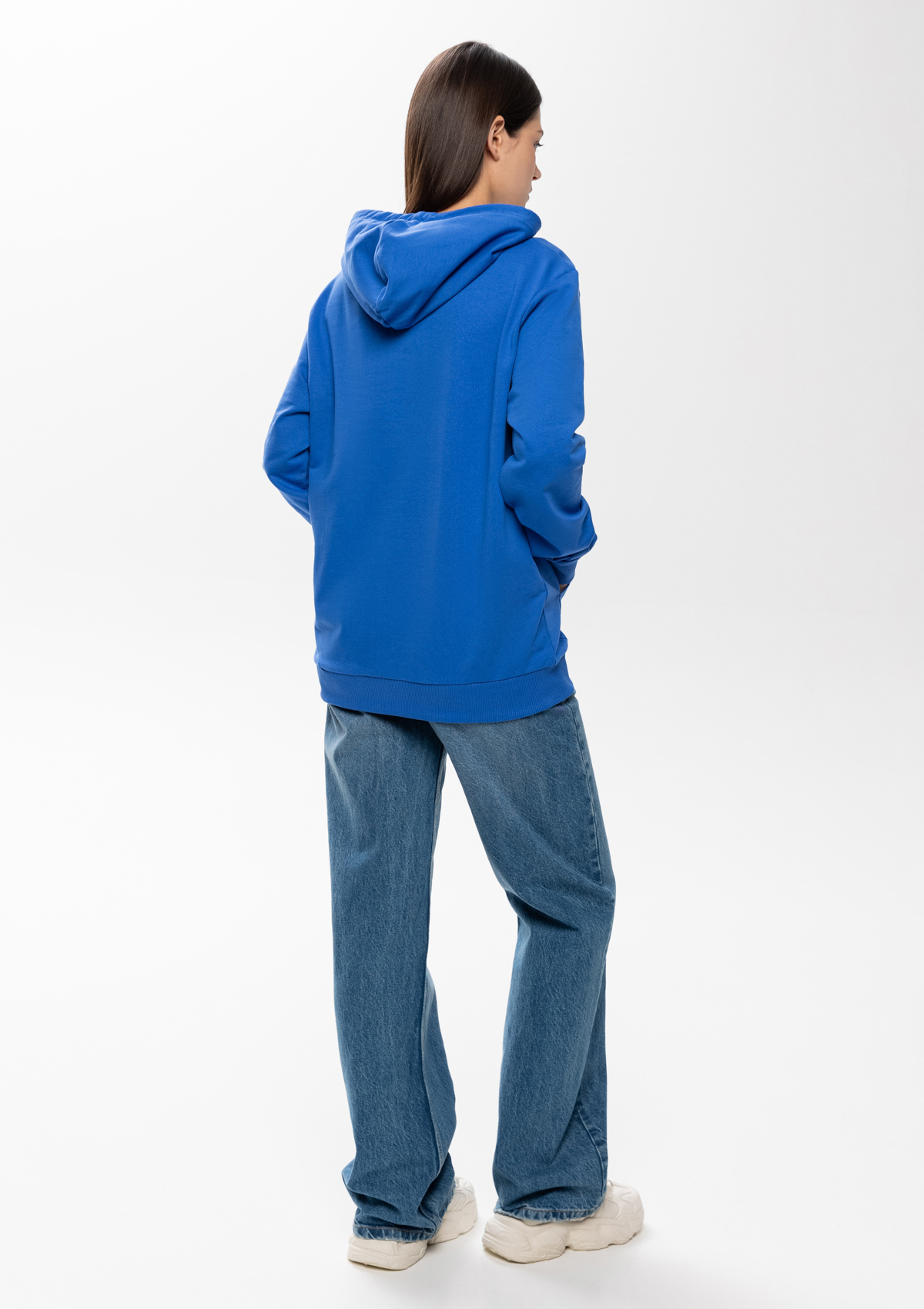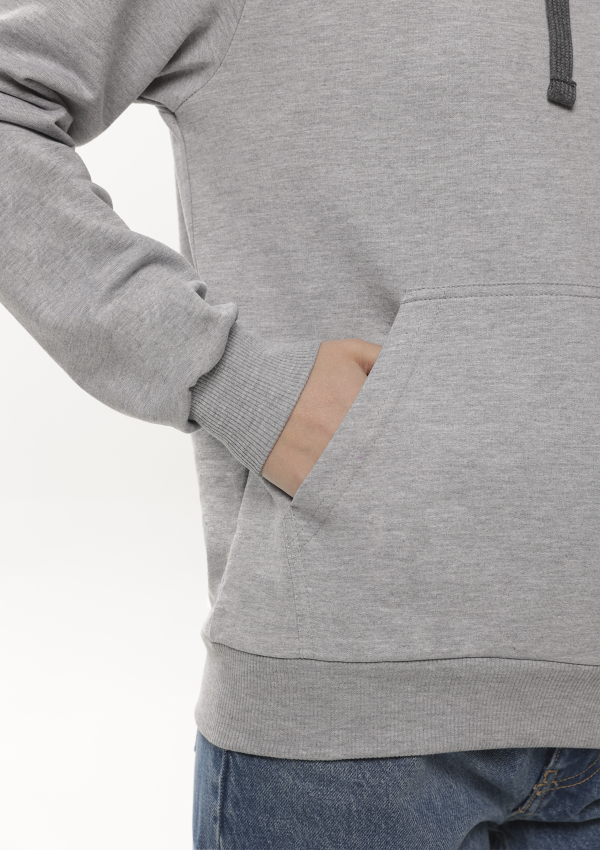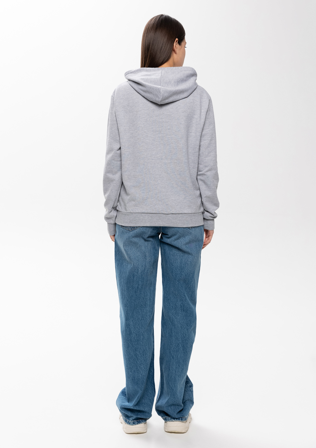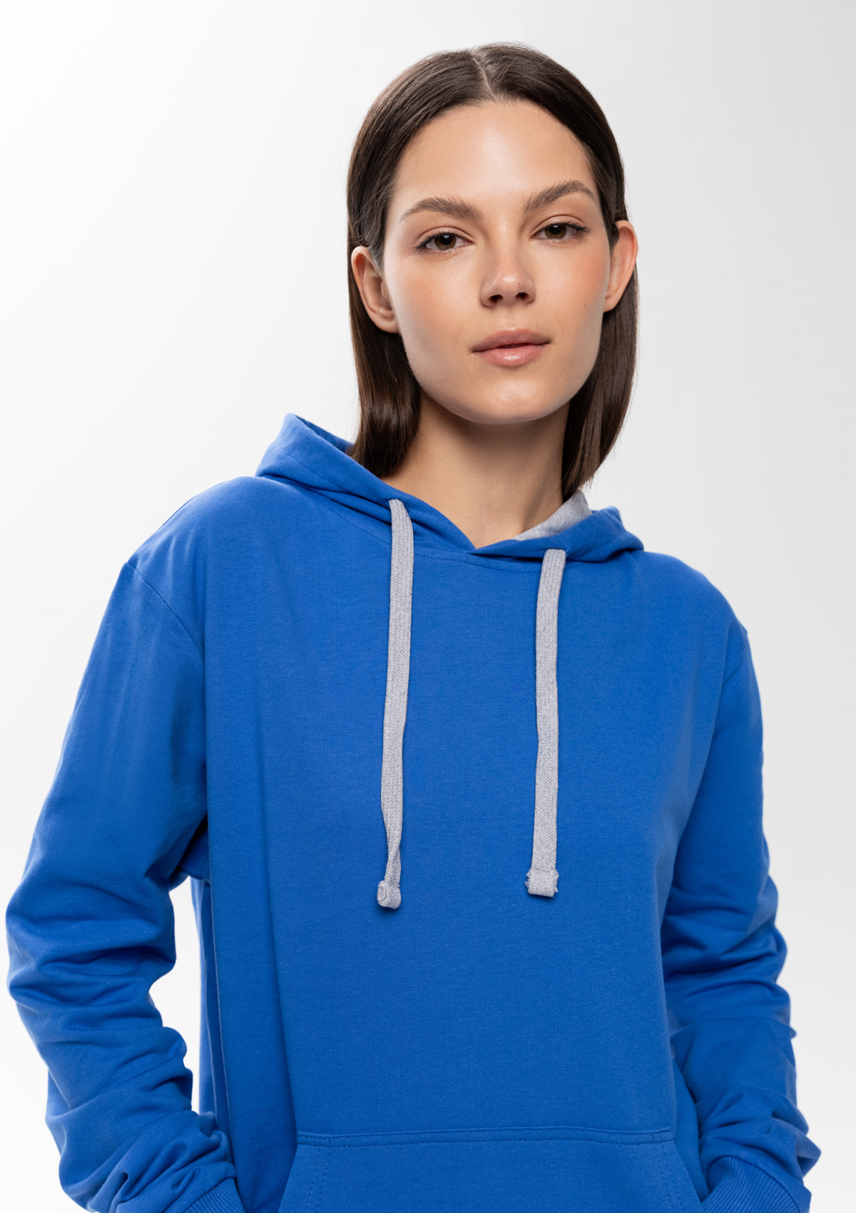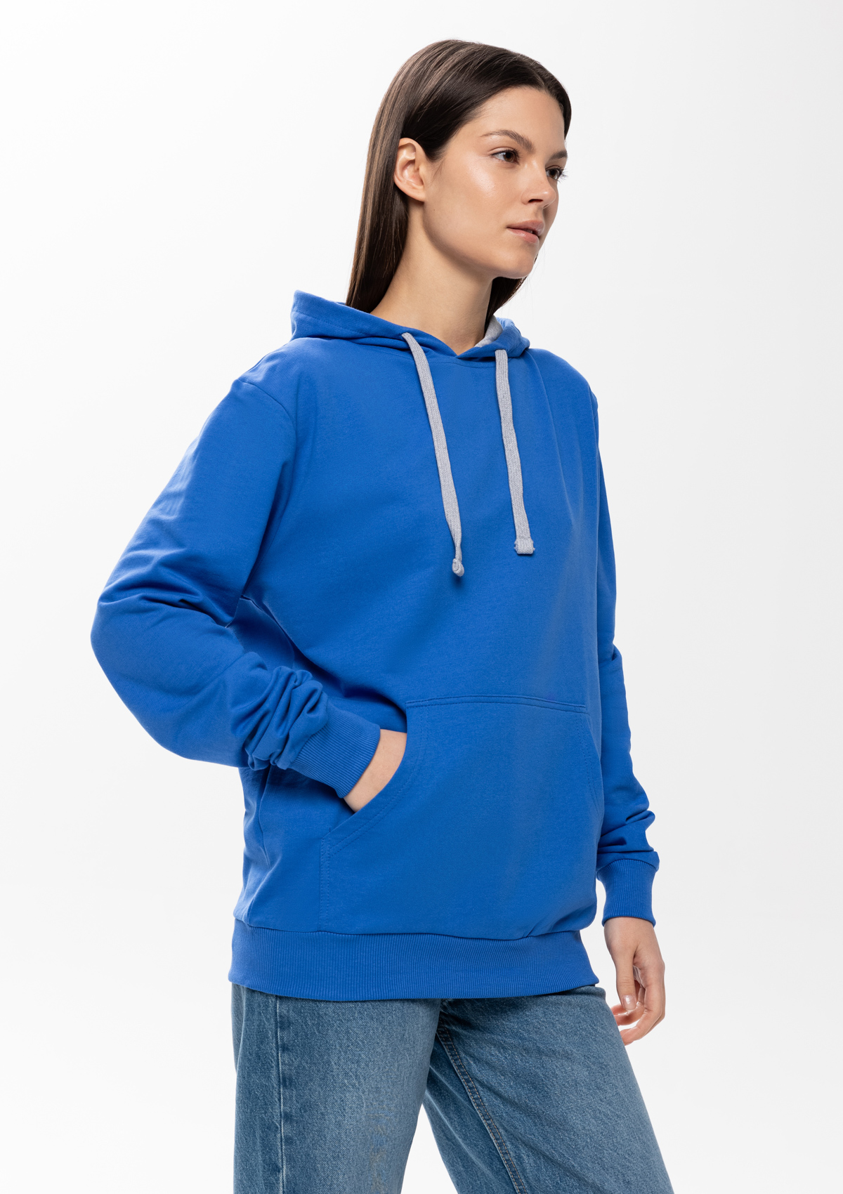 Толстовка прямого силуэта с капюшоном, втачным рукавом и карманом-кенгуру. Капюшон дополнен шнурком для регулирования прилегания, манжет и низ изделия оформлены широкой эластичной резинкой. Возможно два варианта исполнения: контрастные шнурок и бейка/шнурок и бейка в цвет толстовки.