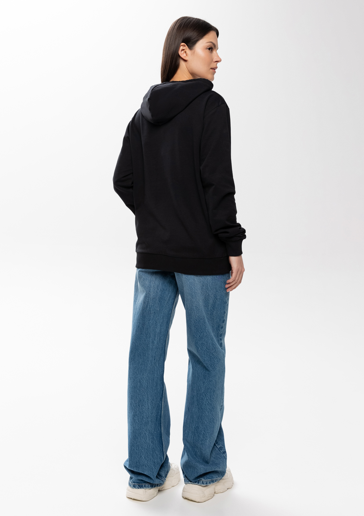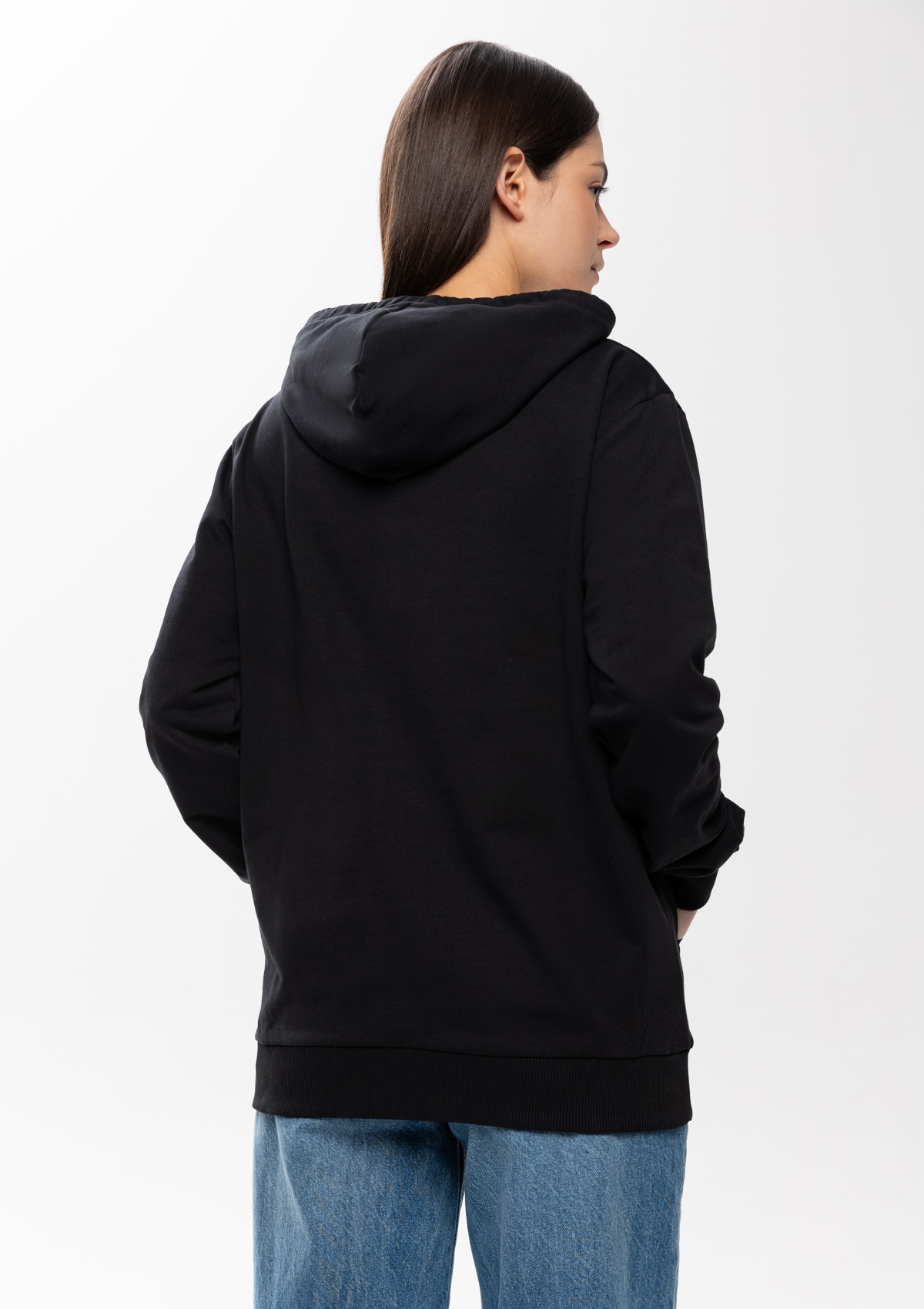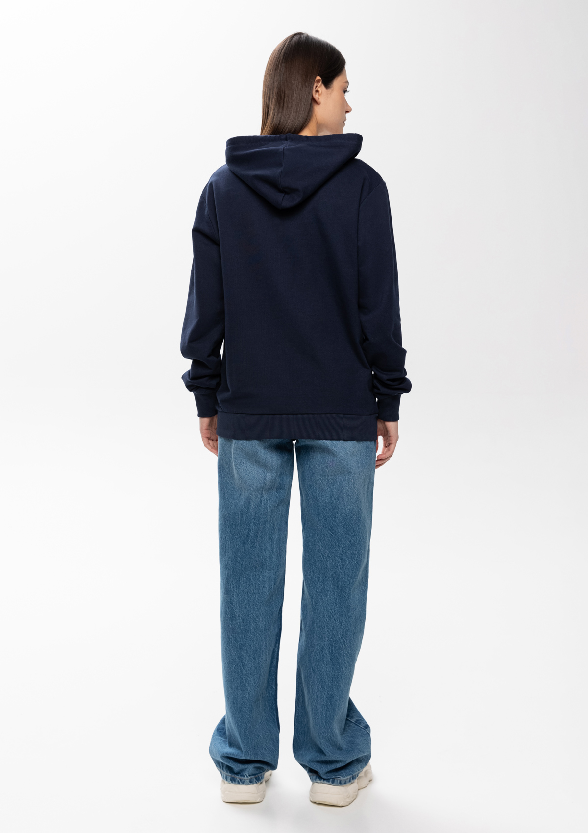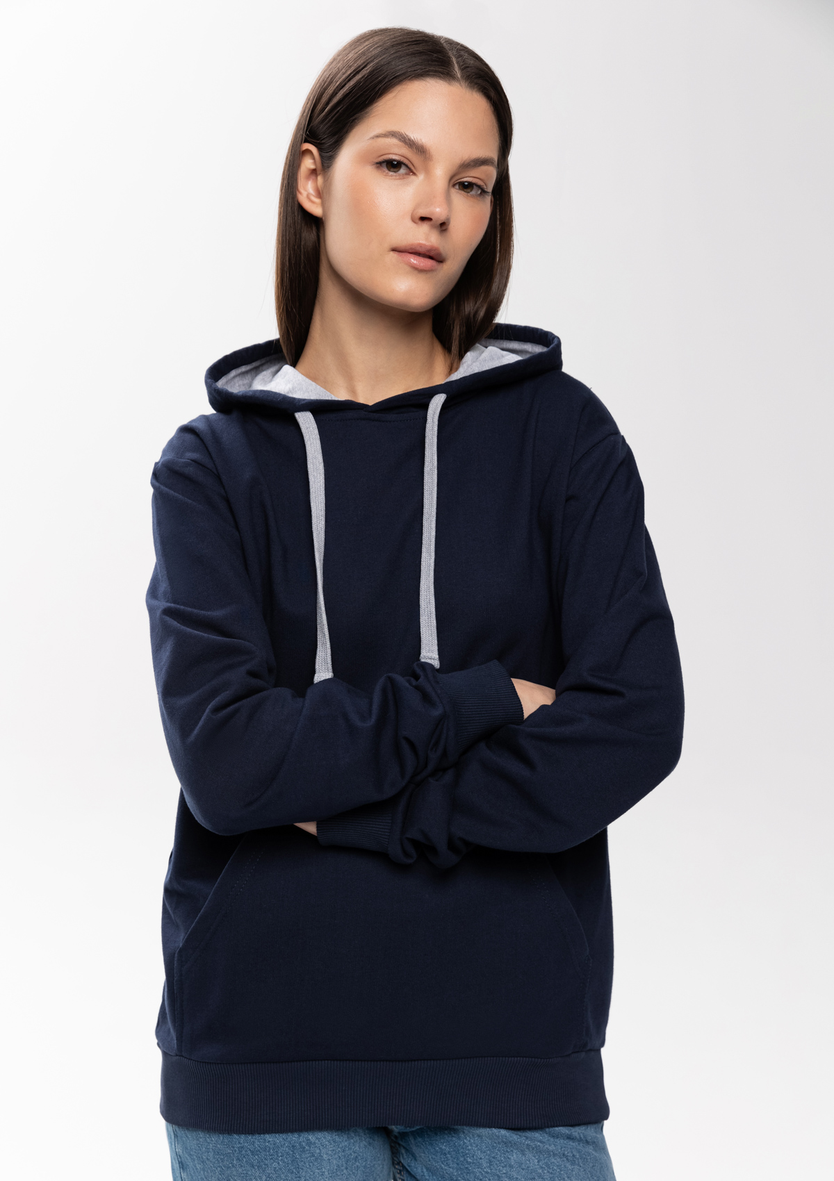 Толстовка прямого силуэта с капюшоном, втачным рукавом и карманом-кенгуру. Капюшон дополнен шнурком для регулирования прилегания, манжет и низ изделия оформлены широкой эластичной резинкой. Возможно два варианта исполнения: контрастные шнурок и бейка/шнурок и бейка в цвет толстовки.