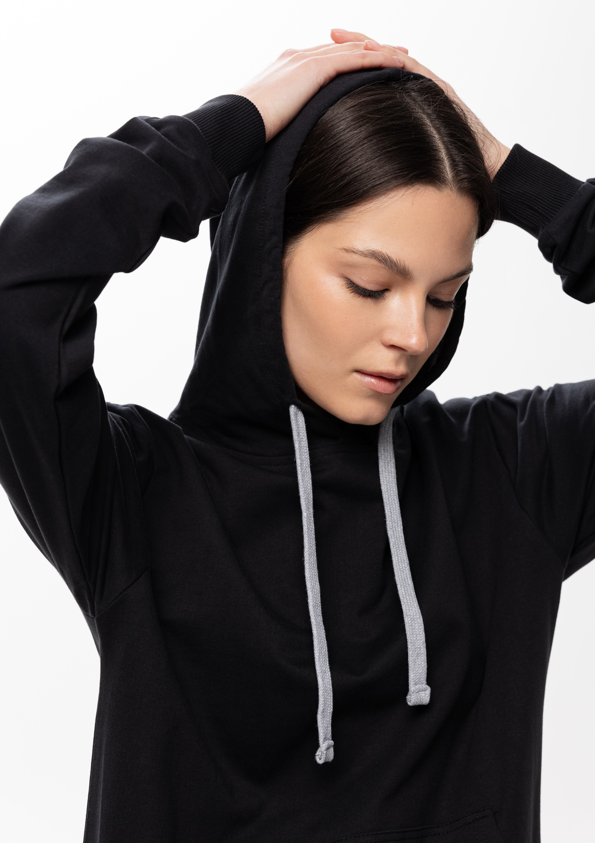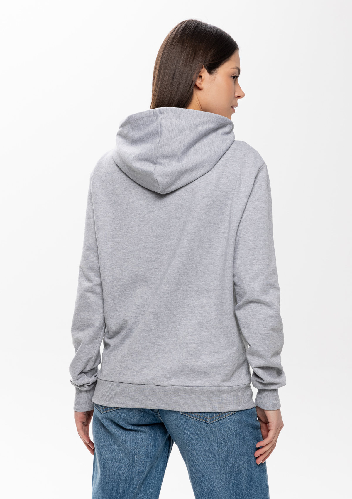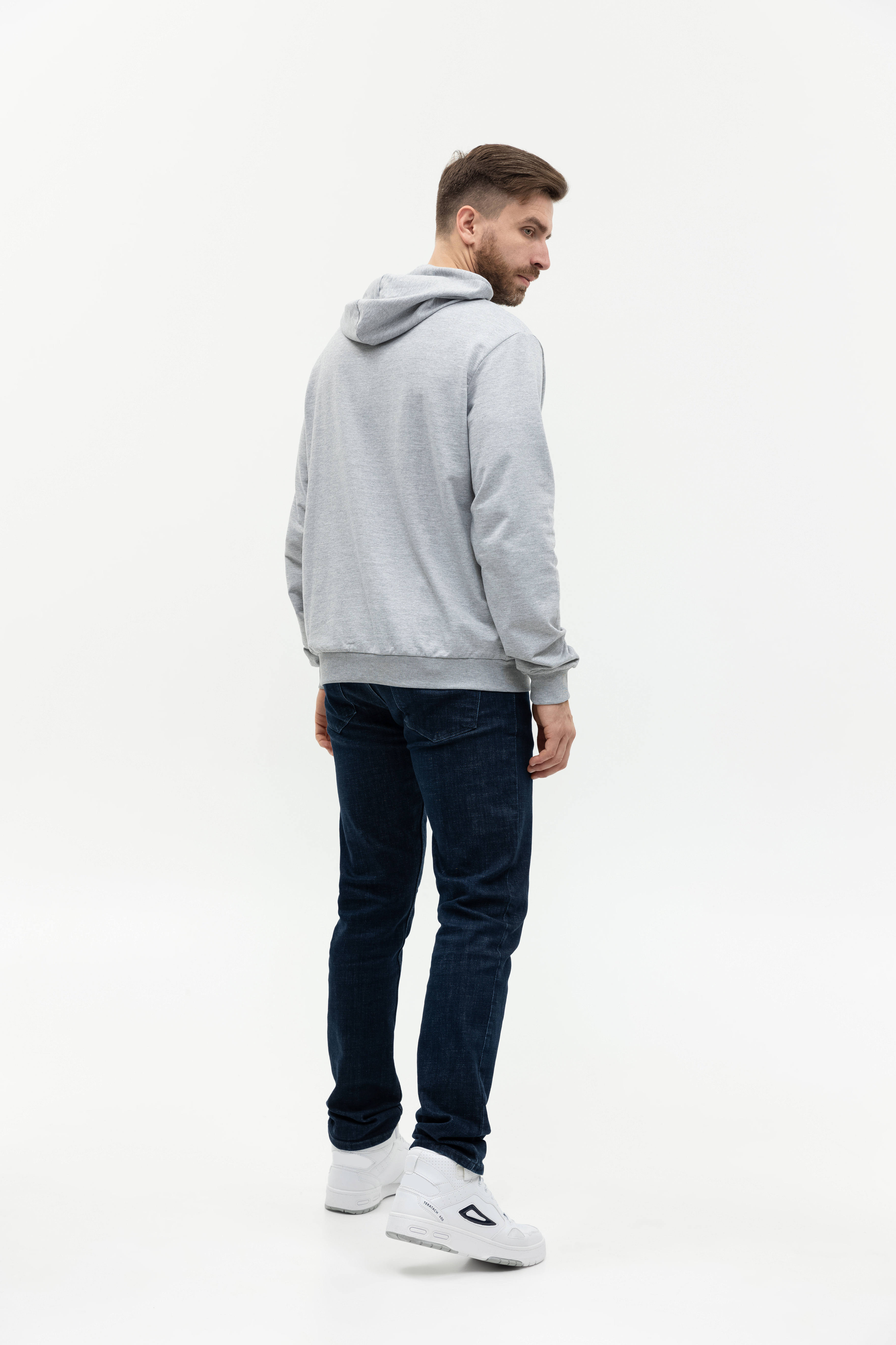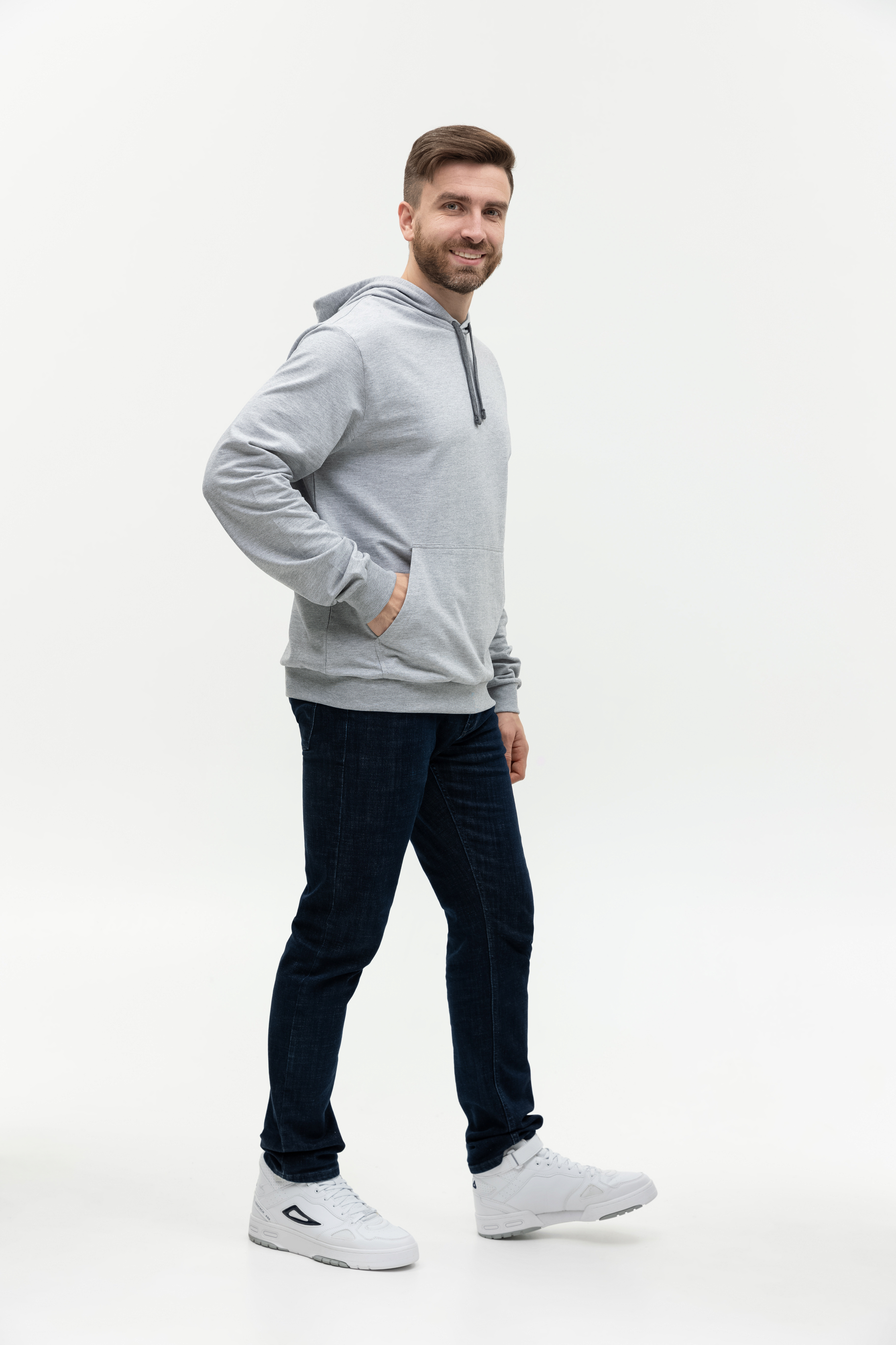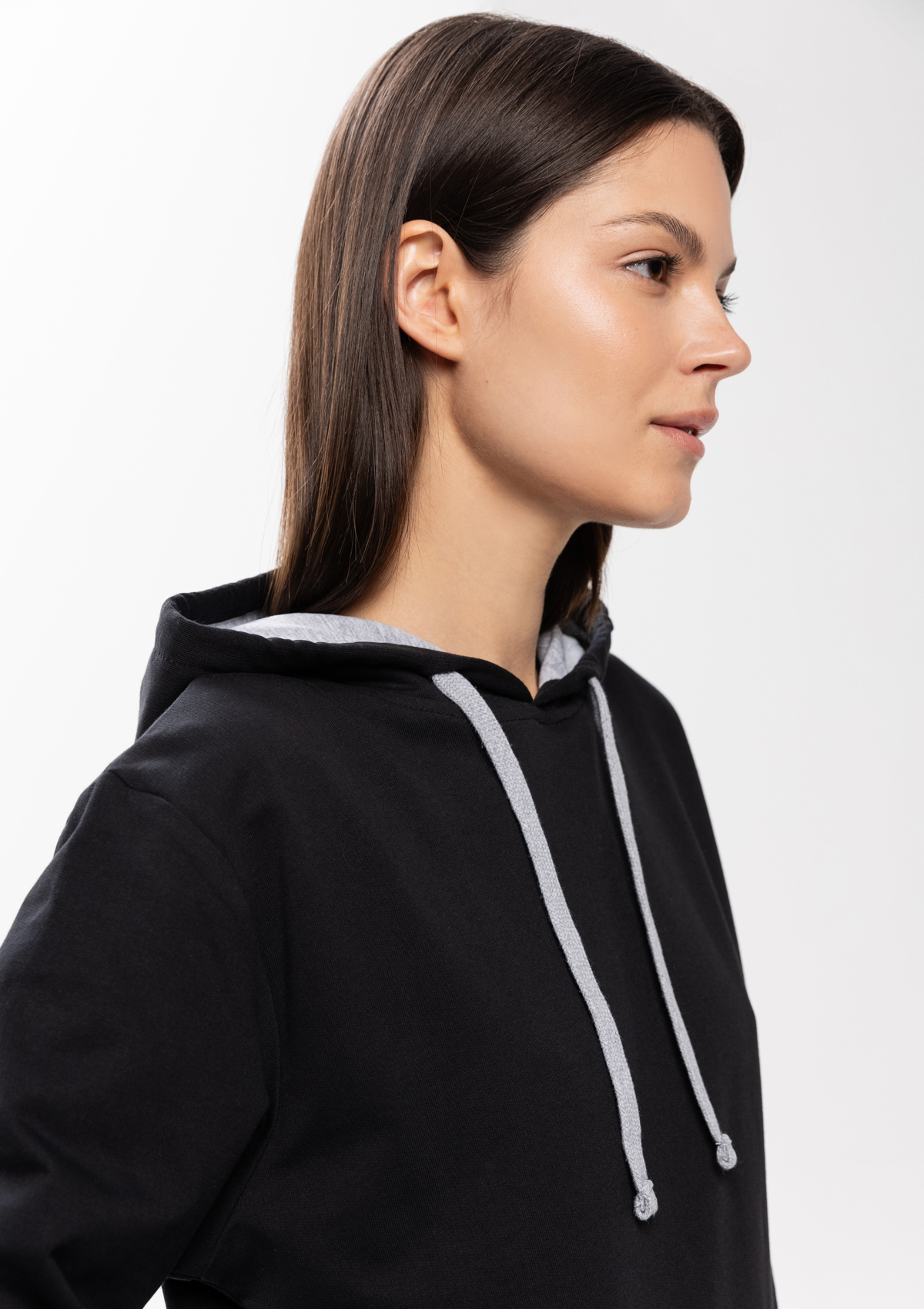 Толстовка прямого силуэта с капюшоном, втачным рукавом и карманом-кенгуру. Капюшон дополнен шнурком для регулирования прилегания, манжет и низ изделия оформлены широкой эластичной резинкой. Возможно два варианта исполнения: контрастные шнурок и бейка/шнурок и бейка в цвет толстовки.
