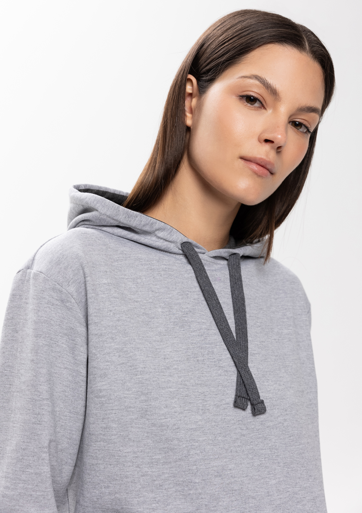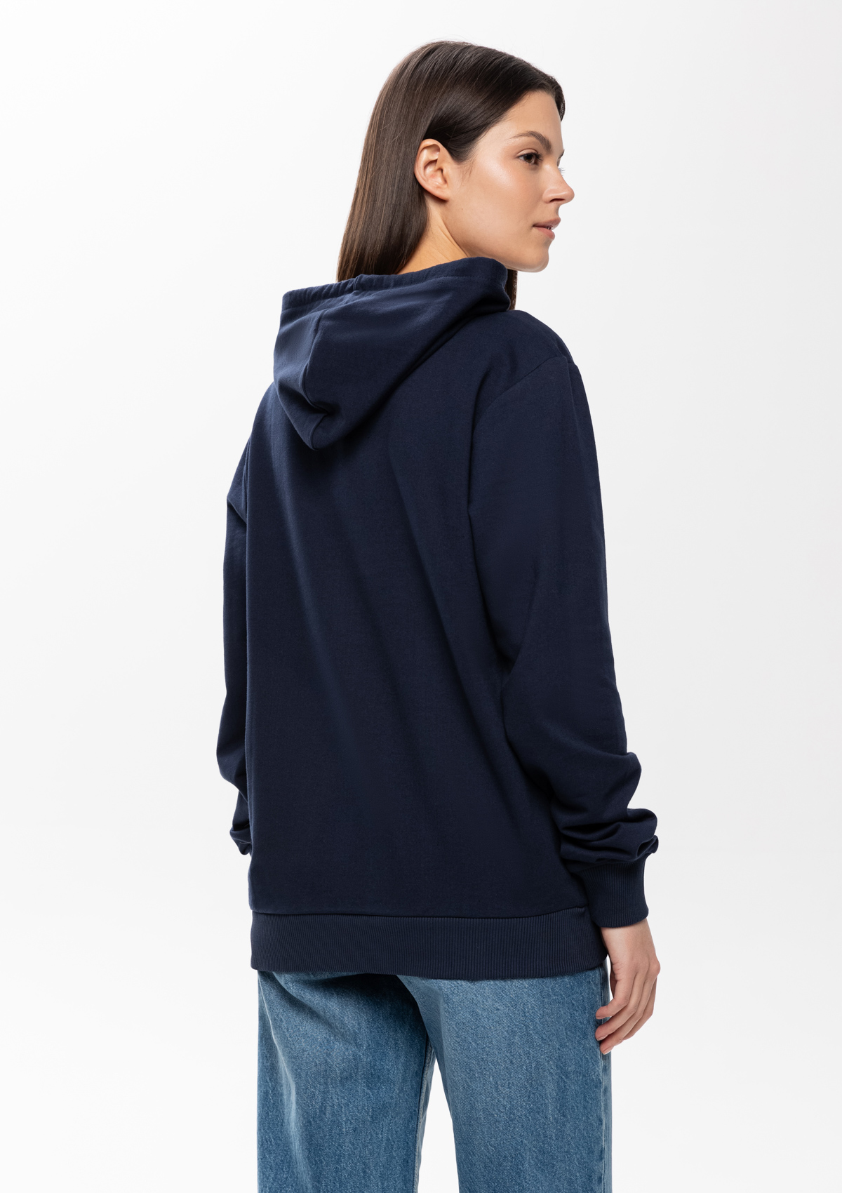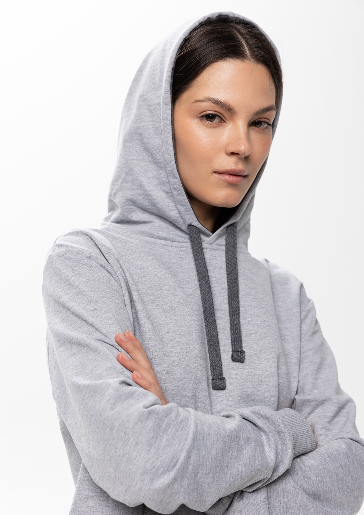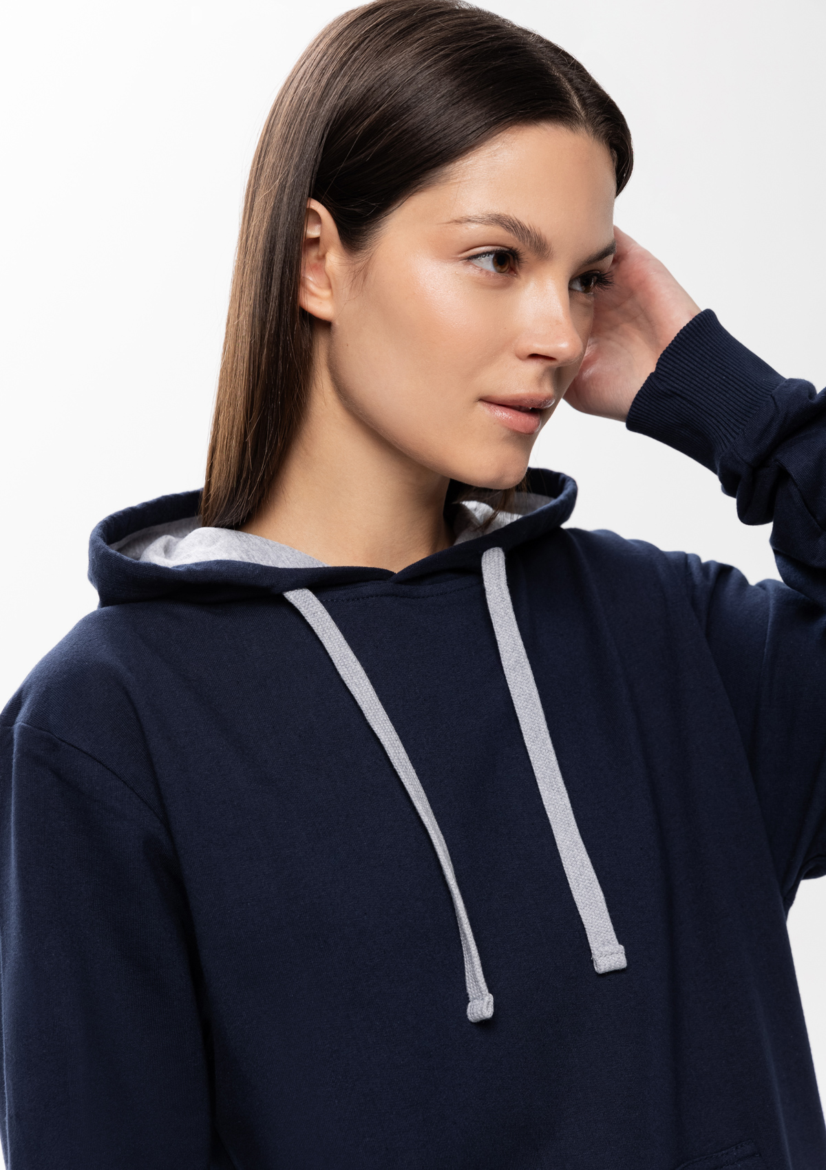 Толстовка прямого силуэта с капюшоном, втачным рукавом и карманом-кенгуру. Капюшон дополнен шнурком для регулирования прилегания, манжет и низ изделия оформлены широкой эластичной резинкой. Возможно два варианта исполнения: контрастные шнурок и бейка/шнурок и бейка в цвет толстовки.