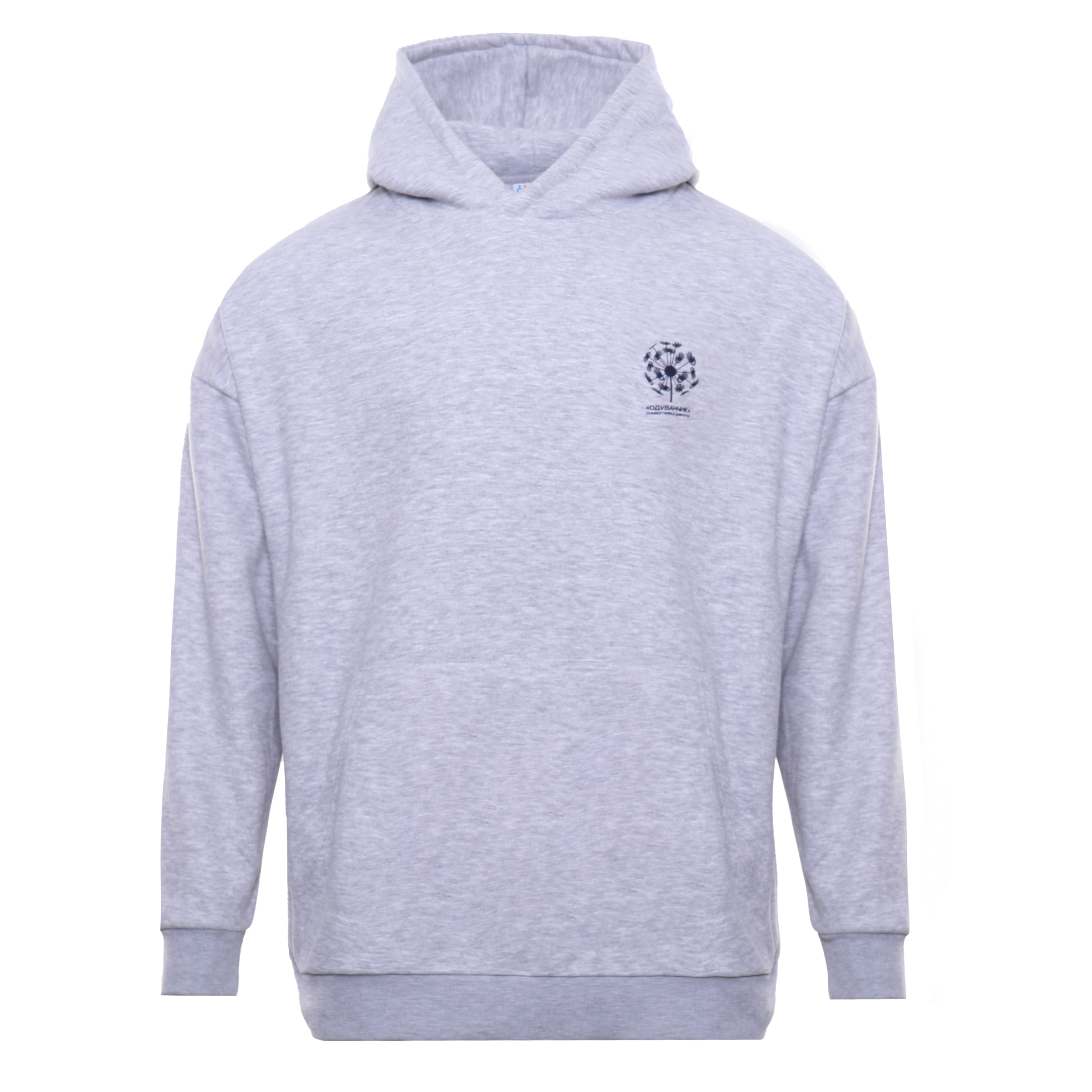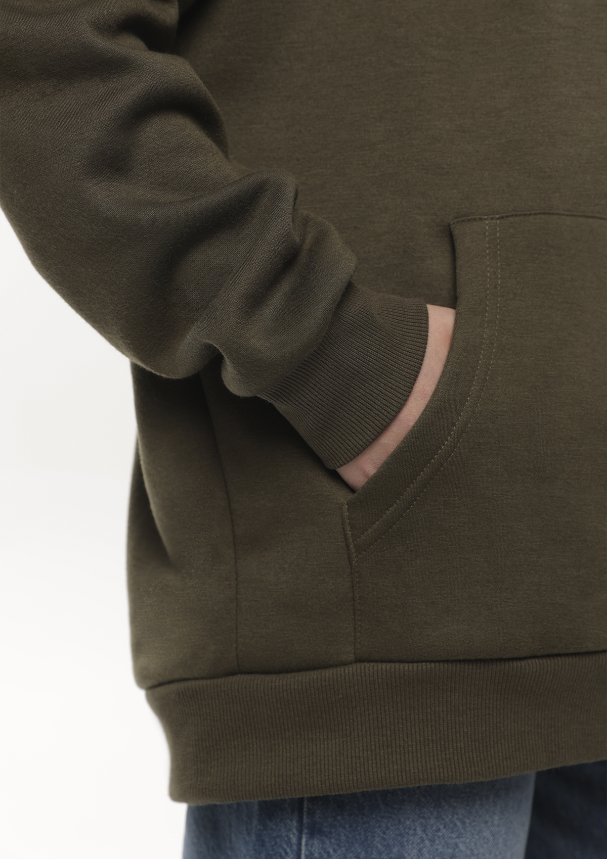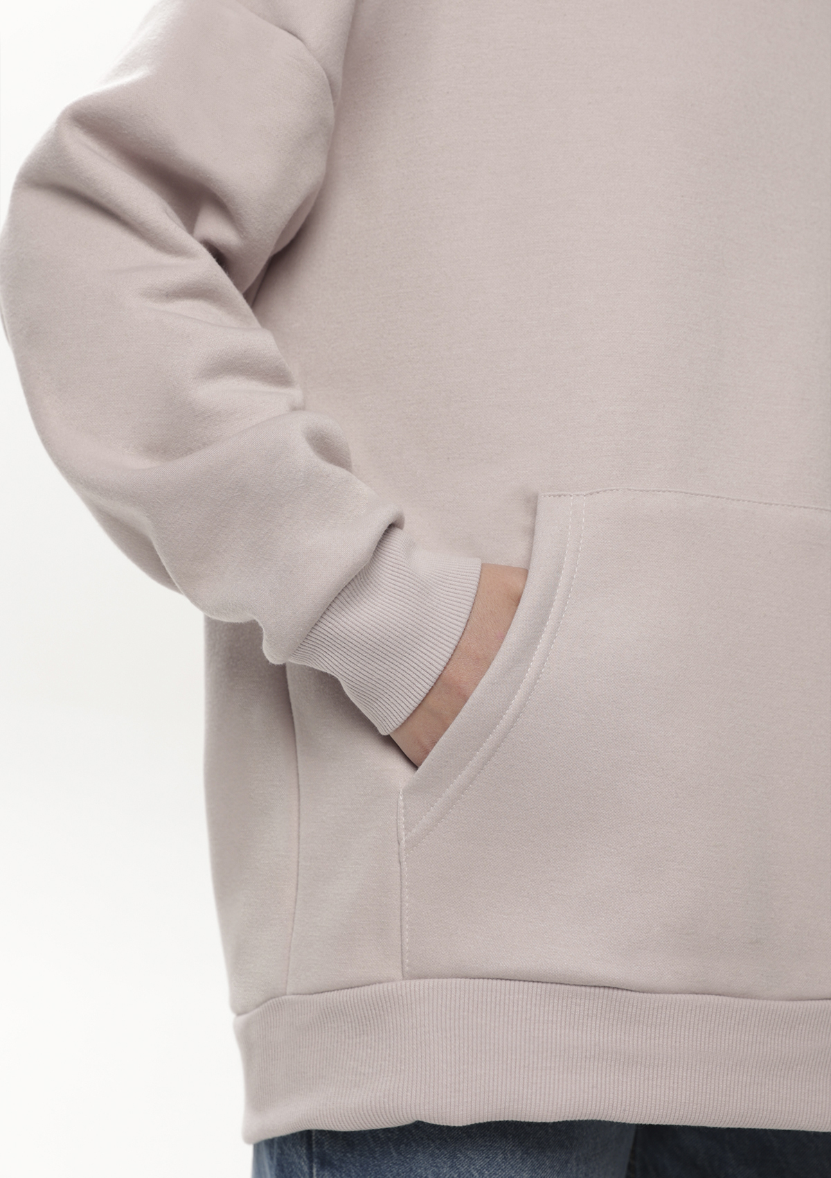 Толстовка свободного силуэта с капюшоном комфортной глубины, спущенной линией плеча и глубоким карманом-кенгуру. Манжет и низ изделия оформлены широкой эластичной резинкой в тон основному цвету.