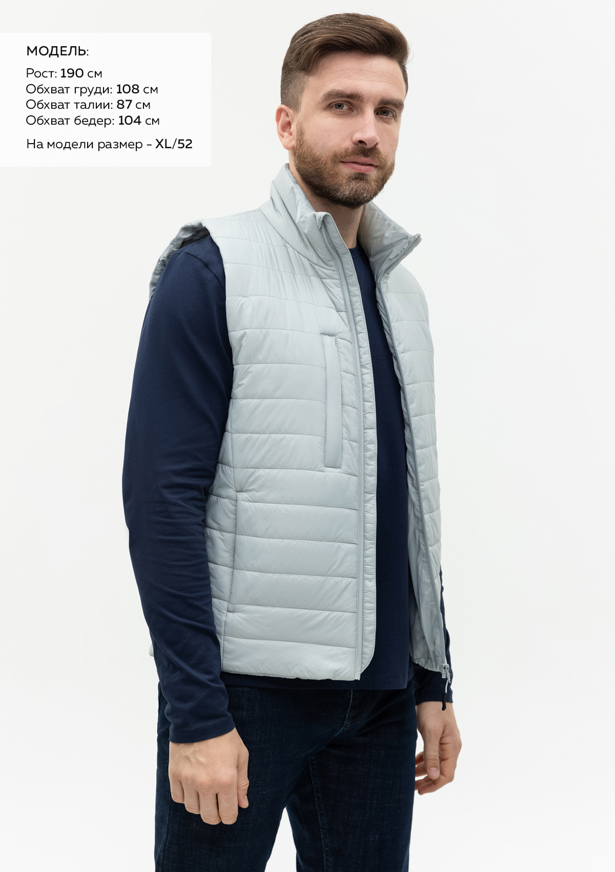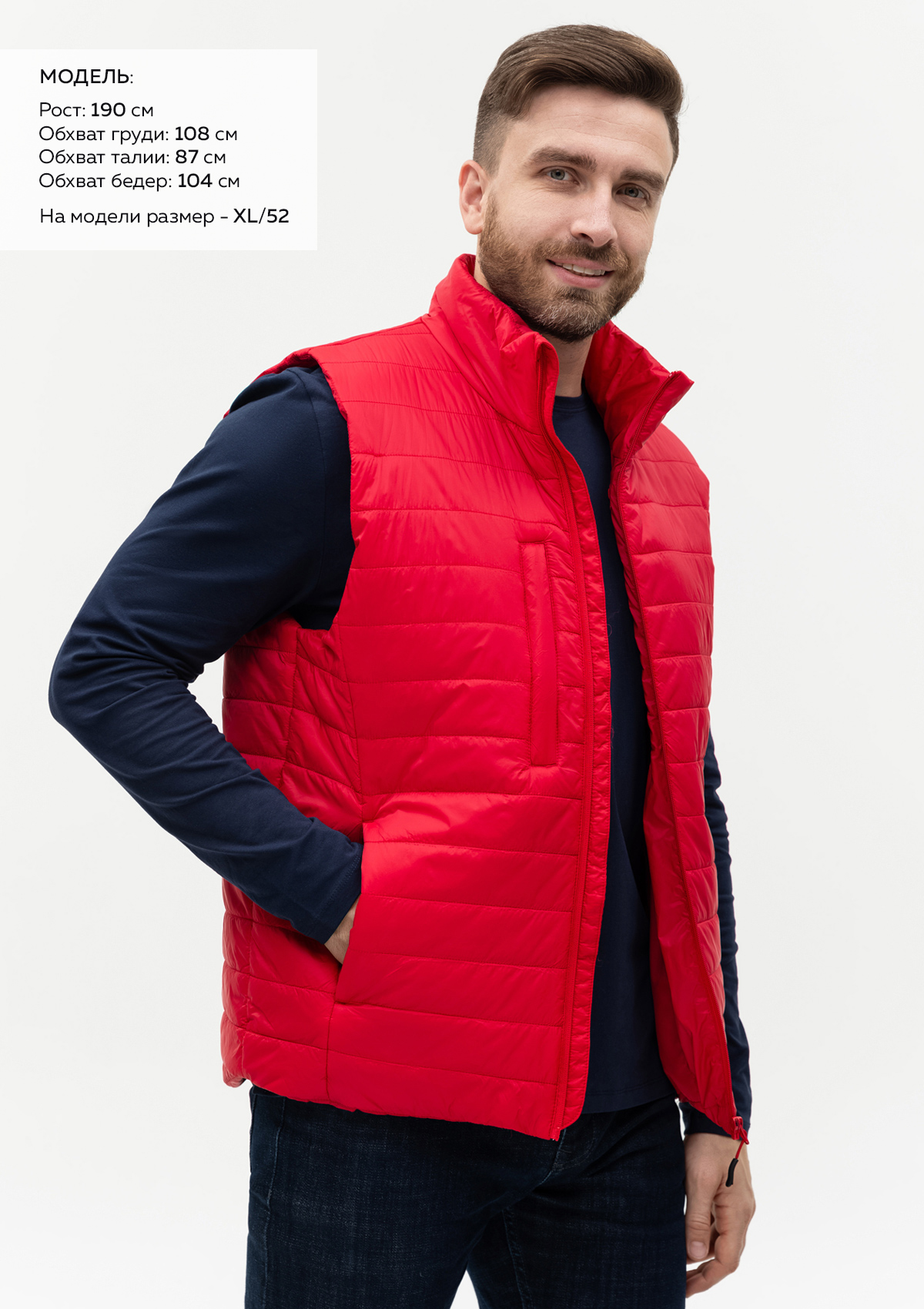 Размер на модели: XL/52. Параметры модели: рост 190 см.; обхват груди 108 см.; обхват талии 87 см.; обхват бедер 104 см.