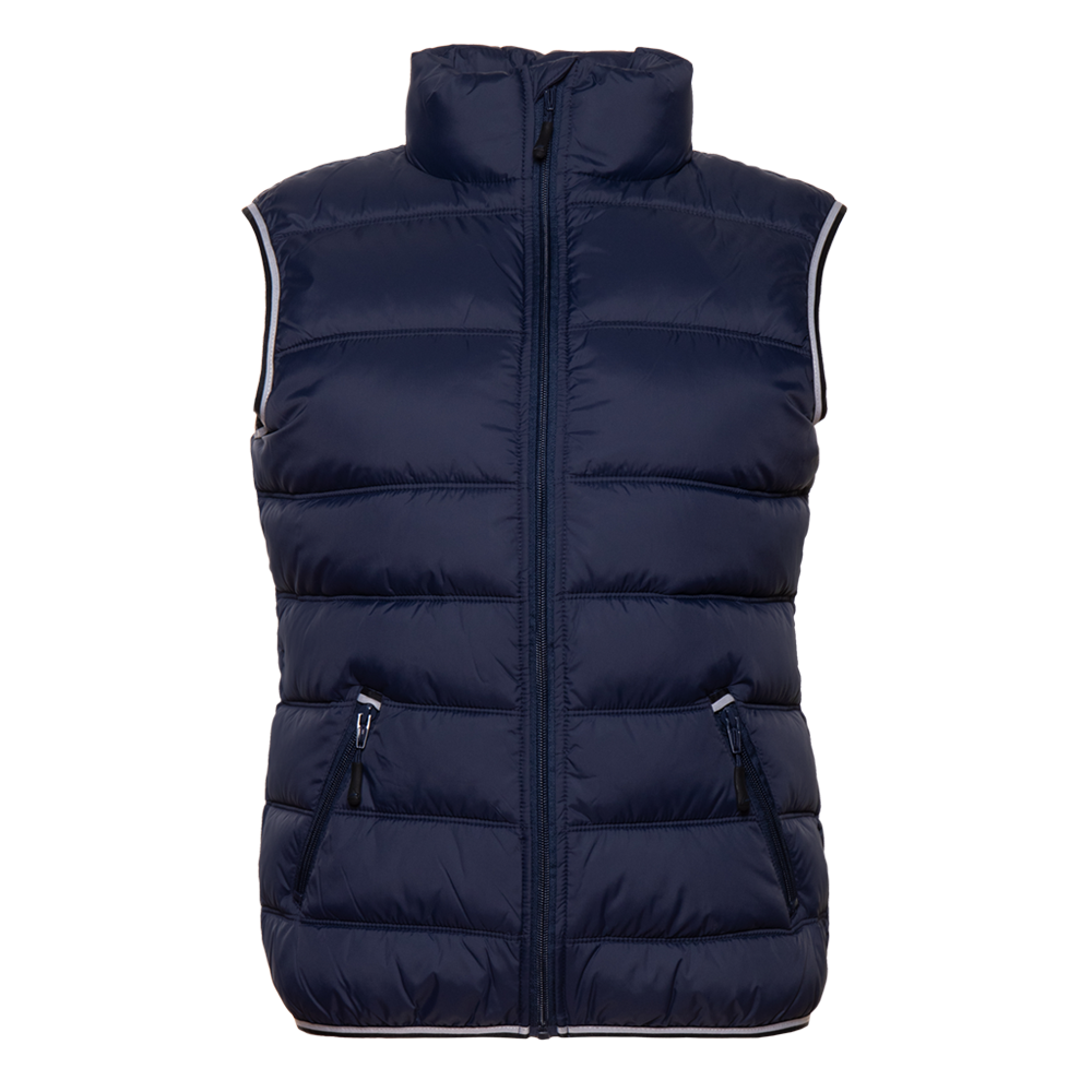 Женский жилет приталенного силуэта с геометричной стежкой, воротником-стойкой, прорезным карманом и застежкой на молнию. Изделие дополнено контрастной резинкой по пройме и линии низа для дополнительной защиты от холода и ветра.