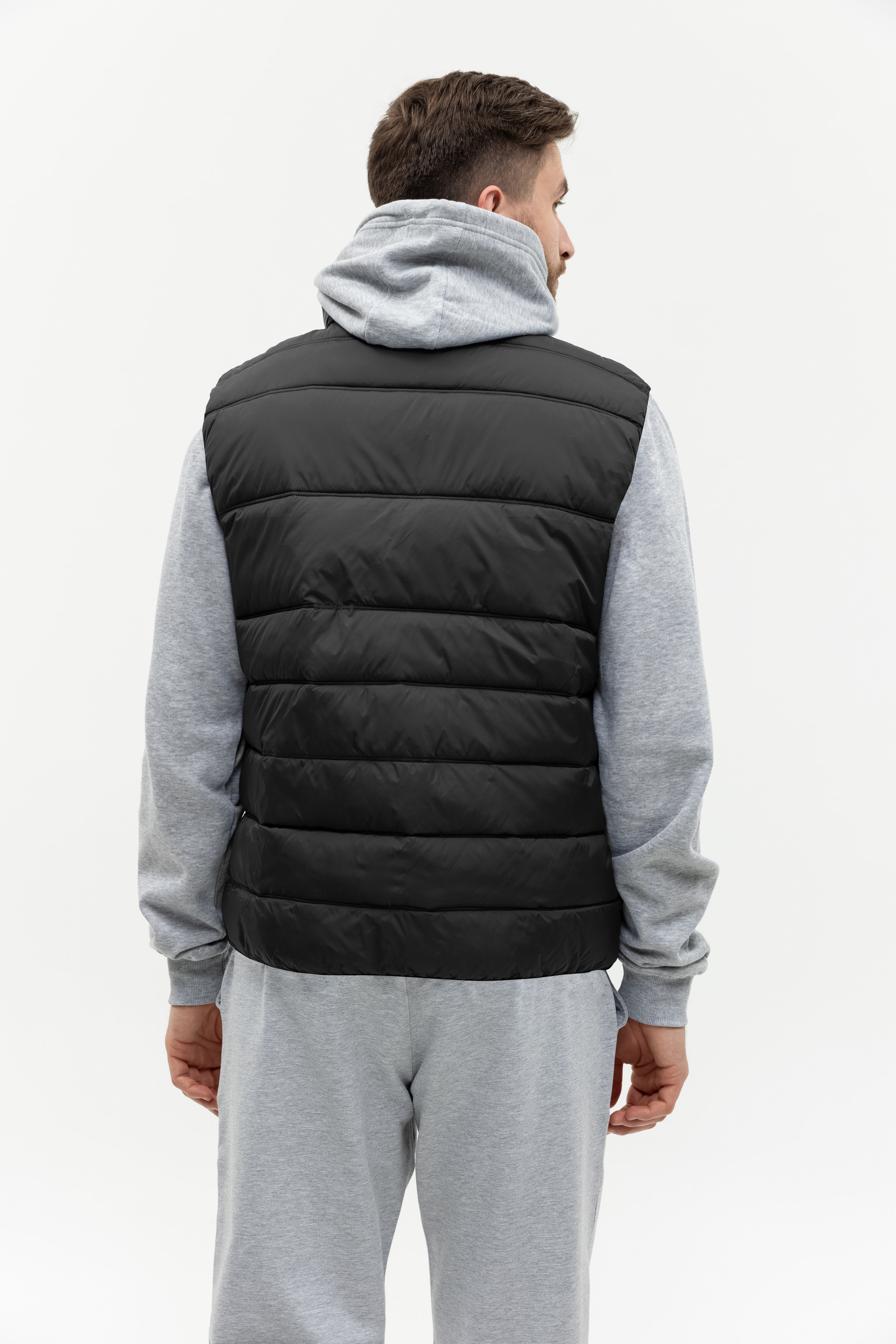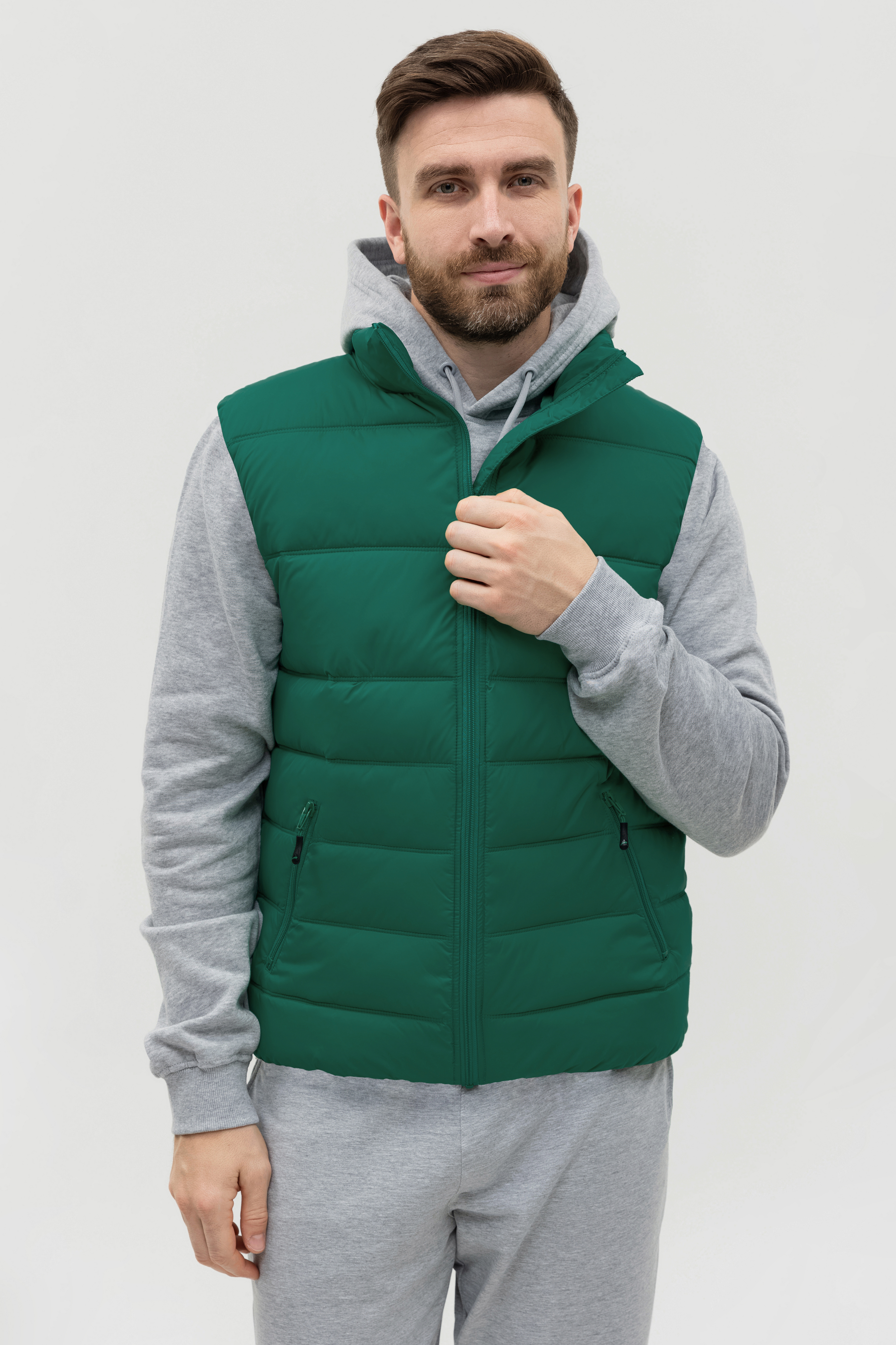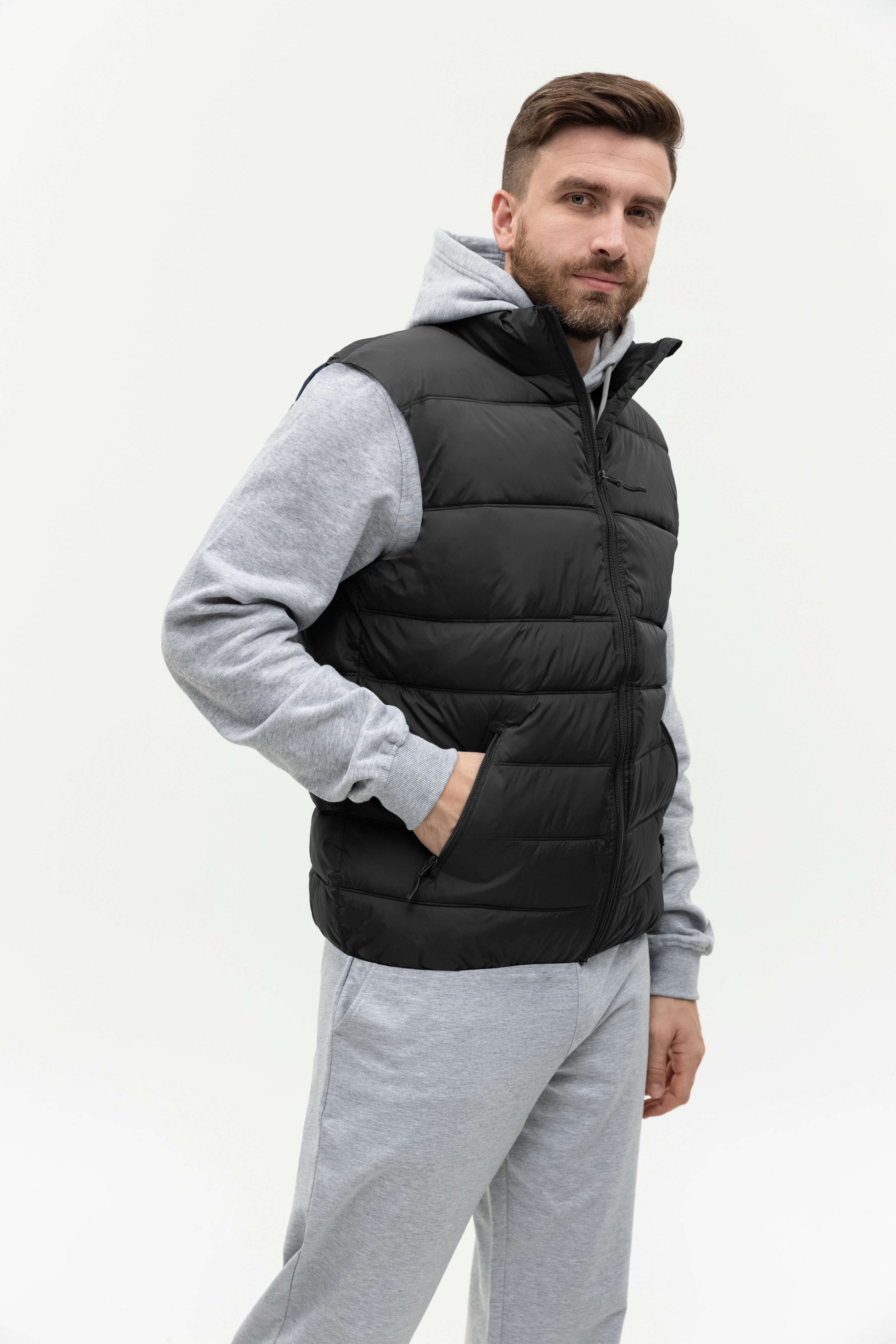 Мужской жилет прямого силуэта с геометричной стежкой, воротником-стойкой, прорезным карманом и застежкой на молнию. Изделие дополнено резинкой по пройме и линии низа для дополнительной защиты от холода и ветра.